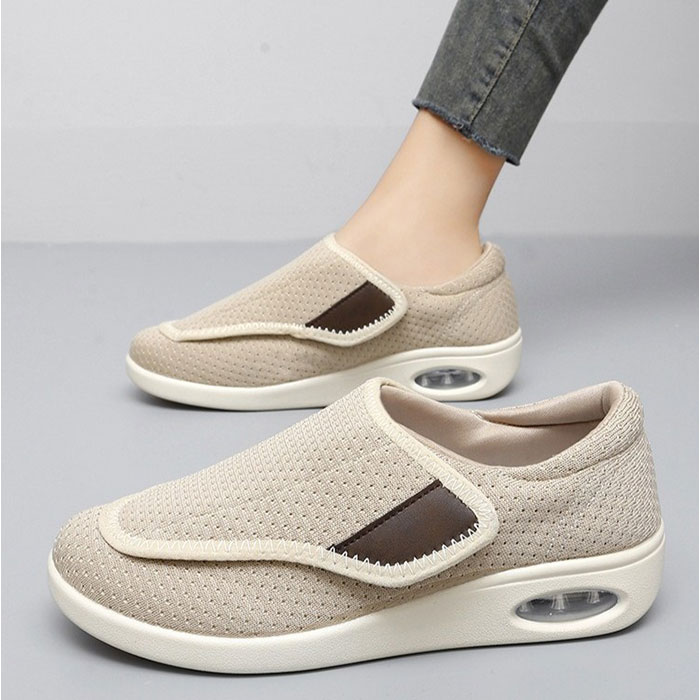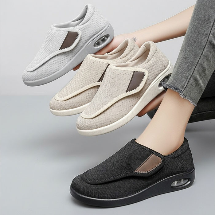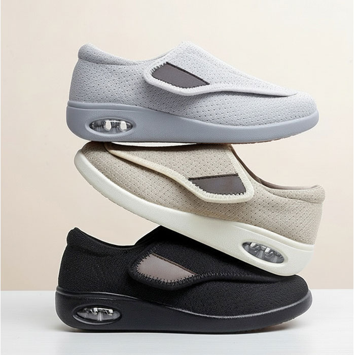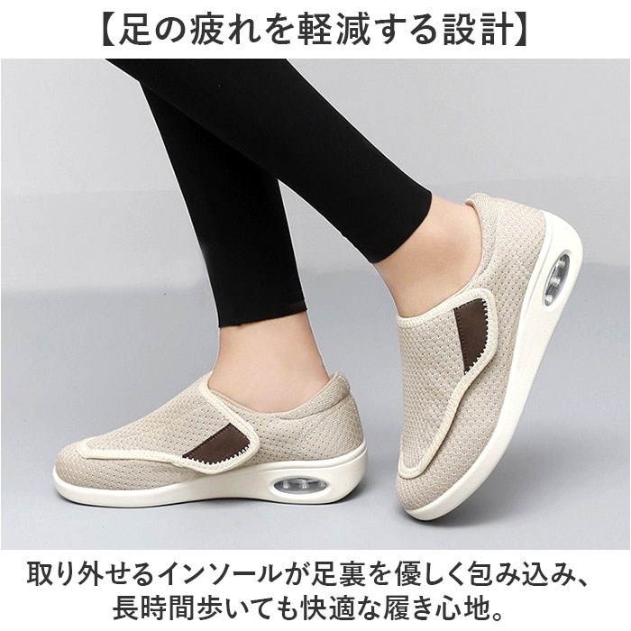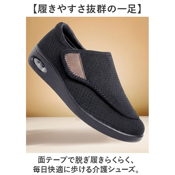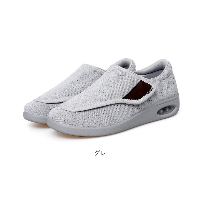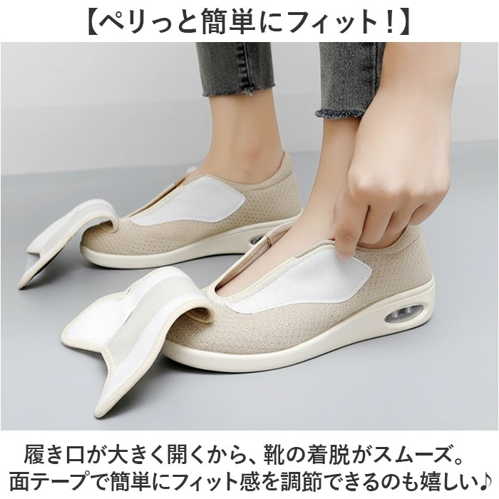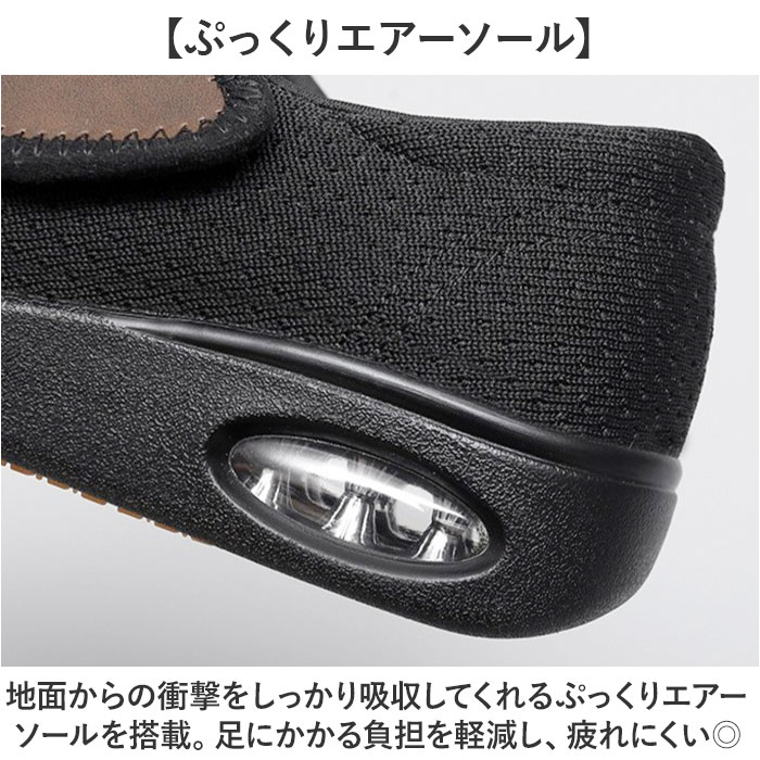 | 【履きやすさ抜群の一足】 ・面テープで脱ぎ履きらくらく、毎日快適に歩ける介護シューズ。 【ぷっくりエアーソール】 ・地面からの衝撃をしっかり吸収してくれるぷっくりエアーソールを搭載。足にかかる負担を軽減し、疲れにくい◎ 【ペリっと簡単にフィット!】 ・履き口が大きく開くから、靴の着脱がスムーズ。面テープで簡単にフィット感を調節できるのも嬉しい♪ 【フローリングも安心の滑り止め】 ・滑り止めを加工した丈夫なソールがポイント。滑りにくく歩きやすいから、お仕事にもぴったり。 【足の疲れを軽減する設計】 ・取り外せるインソールが足裏を優しく包み込み、長時間歩いても快適な履き心地。 |