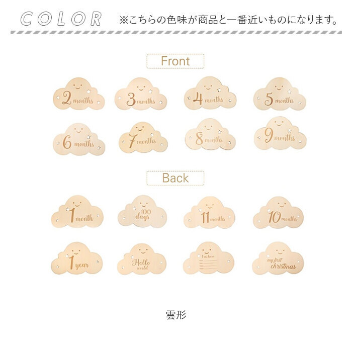 | 【お子さまの成長記録を可愛く撮影】 ・手軽にデコレーション♪生まれた日から使える「ベビーマンスリーカード 雲型8枚セット」。 【月齢フォトや初めてのイベントに】 ・生まれた日から100日、1歳までの記念&初めてのクリスマス☆置くだけで可愛く演出! (※)両面使える8枚セットです。 【生まれた日の記録も一緒に】 ・名前や生年月日、出生身長&体重を記入することも可能。家族の思い出をカタチに♪ 【ナチュラルな雲形木製バナー】 ・シンプルな木製バナーを雲型に!お顔入り&星型のくり抜きもキュート。 |