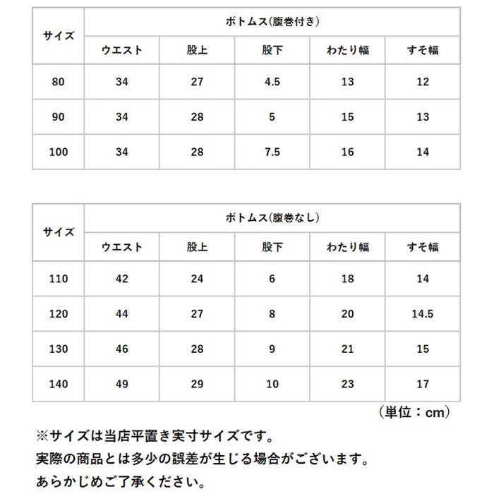 | [キッズ] ・80cm(腹巻付き) ・90cm(腹巻付き) ・100cm(腹巻付き) ・110cm(腹巻なし) ・120cm(腹巻なし) ・130cm(腹巻なし) ・140cm(腹巻なし) ※サイズについて詳細は、商品画像の中にあるサイズ表をご覧くださいませ。 |