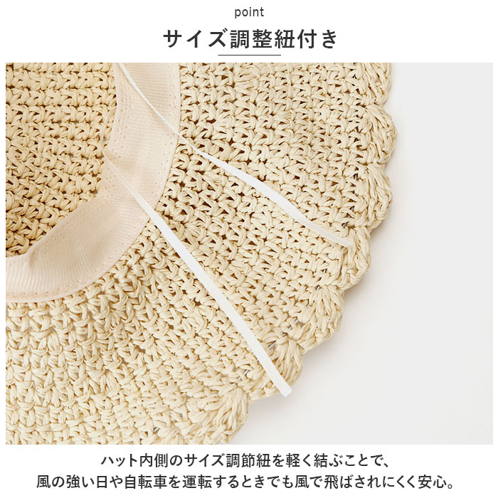 ・ハット内側のサイズ調節紐を軽く結ぶことで、風の強い日や自転車を運転するときでも風で飛ばされにくく安心。