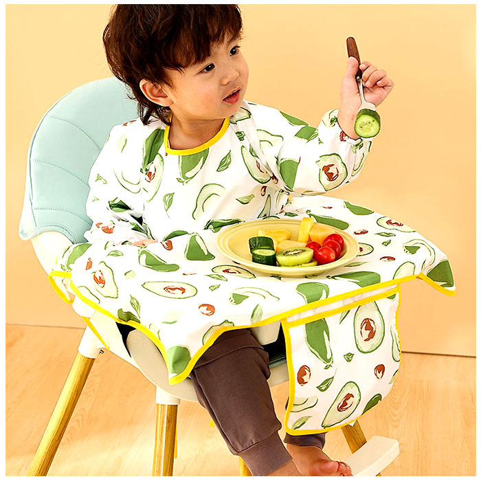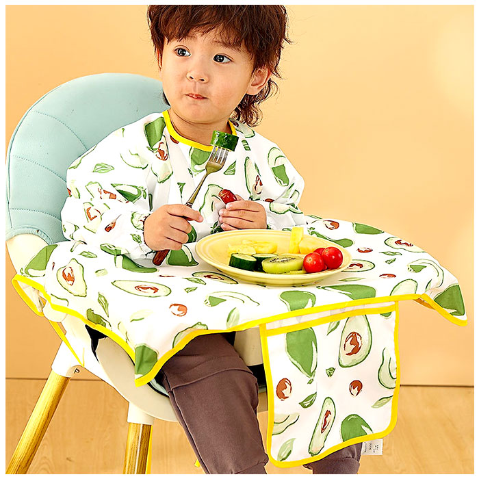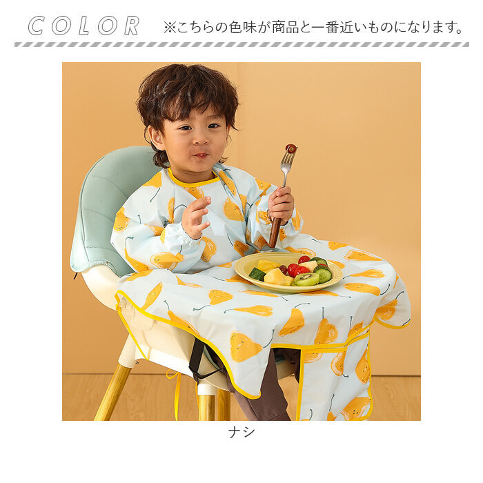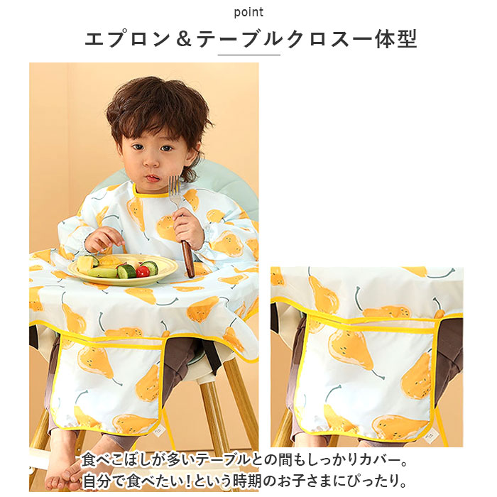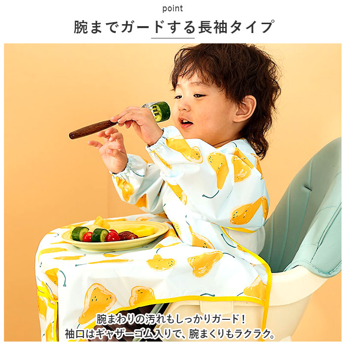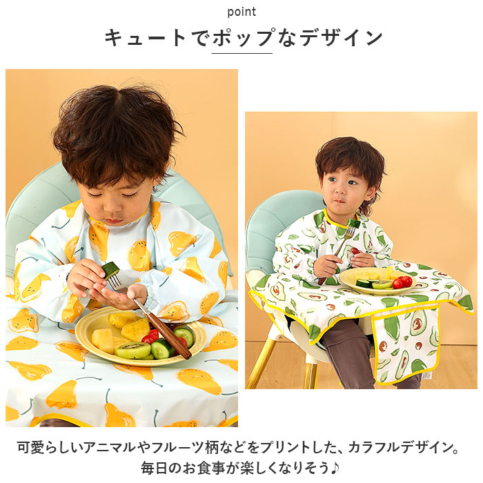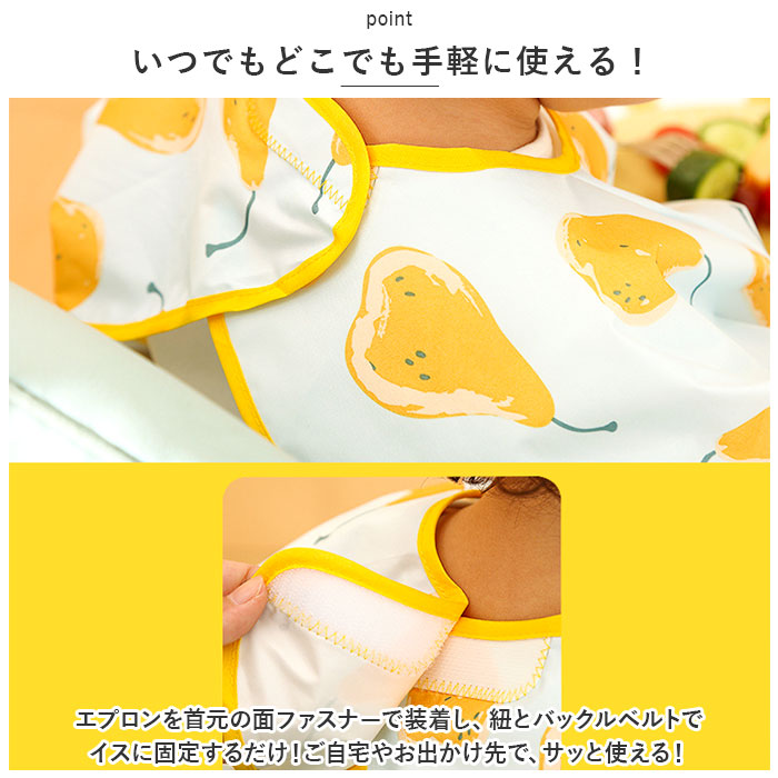 | ・食べこぼしの汚れからしっかり守る、テーブルクロス一体型のキッズ食事エプロンが登場。 【いつでもどこでも手軽に使える!】 ・エプロンを首元の面ファスナーで装着し、紐とバックルベルトでイスに固定するだけ!ご自宅やお出かけ先で、サッと使える! 【エプロン&テーブルクロス一体型】 ・食べこぼしが多いテーブルとの間もしっかりカバー。自分で食べたい!という時期のお子さまにぴったり。 【はっ水素材で片付けラクラク】 ・はっ水性のあるポリエステル素材を採用しており、汚れをすぐに拭き取れて洋服などへの染み込みを防止。テーブルの片付けもスムーズで、ママも笑顔☆ 【腕までガードする長袖タイプ】 ・腕まわりの汚れもしっかりガード!袖口はギャザーゴム入りで、腕まくりもラクラク。 【持ち運びに便利】 ・折りたたんでポケットに収納すれば、コンパクトサイズに。お出かけ用のバッグにかさばることなく、忍ばせられるのが嬉しい! 【キュートでポップなデザイン】 ・可愛らしいアニマルやフルーツ柄などをプリントした、カラフルデザイン。毎日のお食事が楽しくなりそう♪ 【使い方いろいろ】 ・お食事以外にも、絵の具を使ったお絵かきや粘土遊びなど!汚れを気にせずおもいっきり遊ばせてあげたい時に大活躍のアイテム。 |