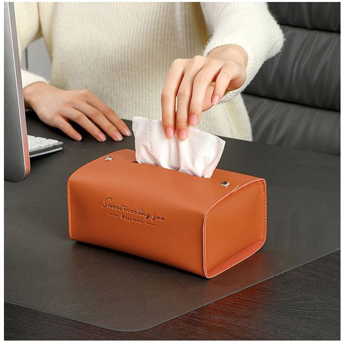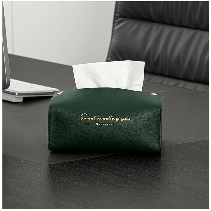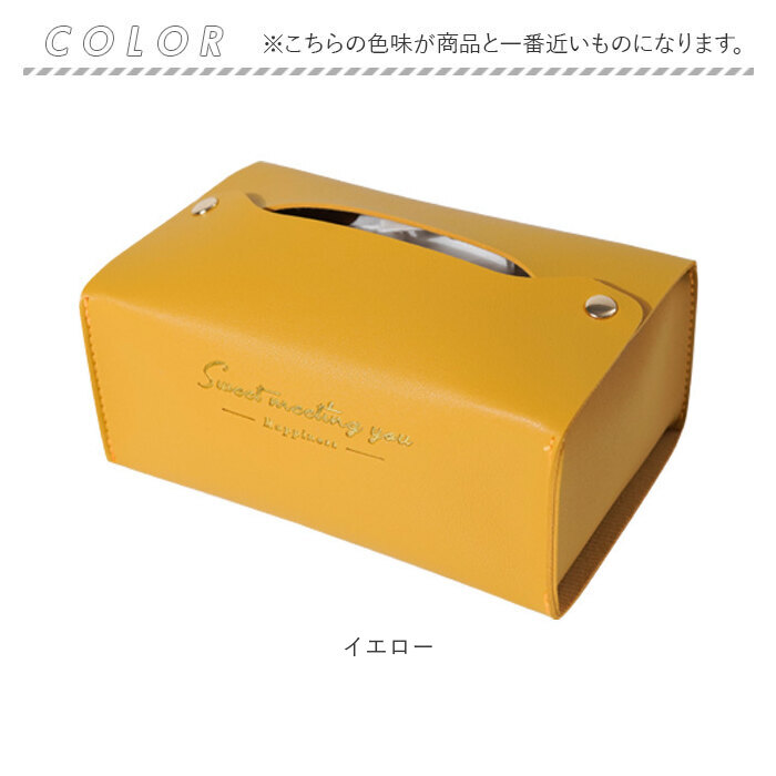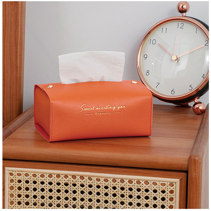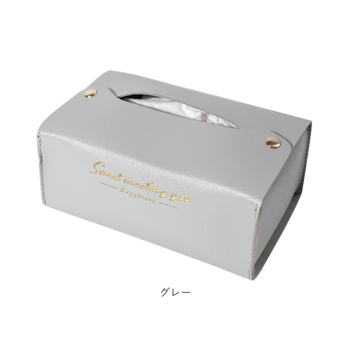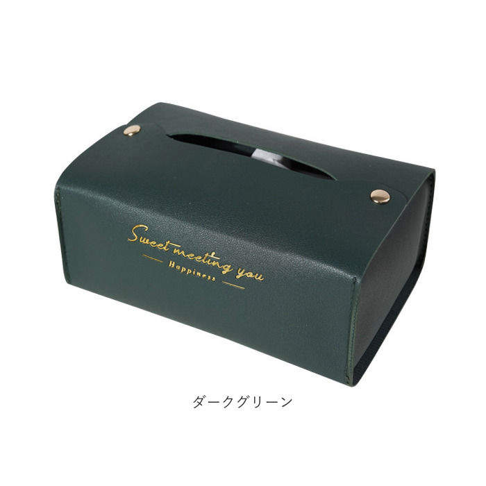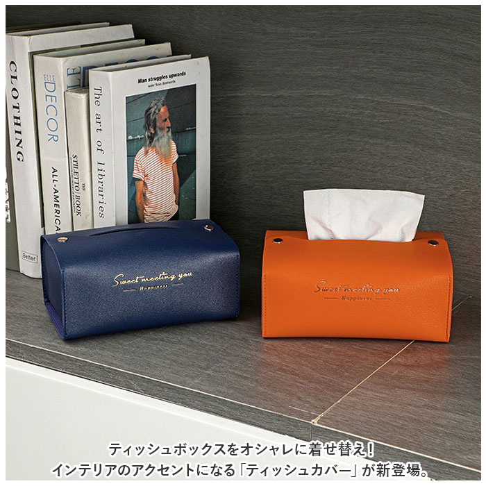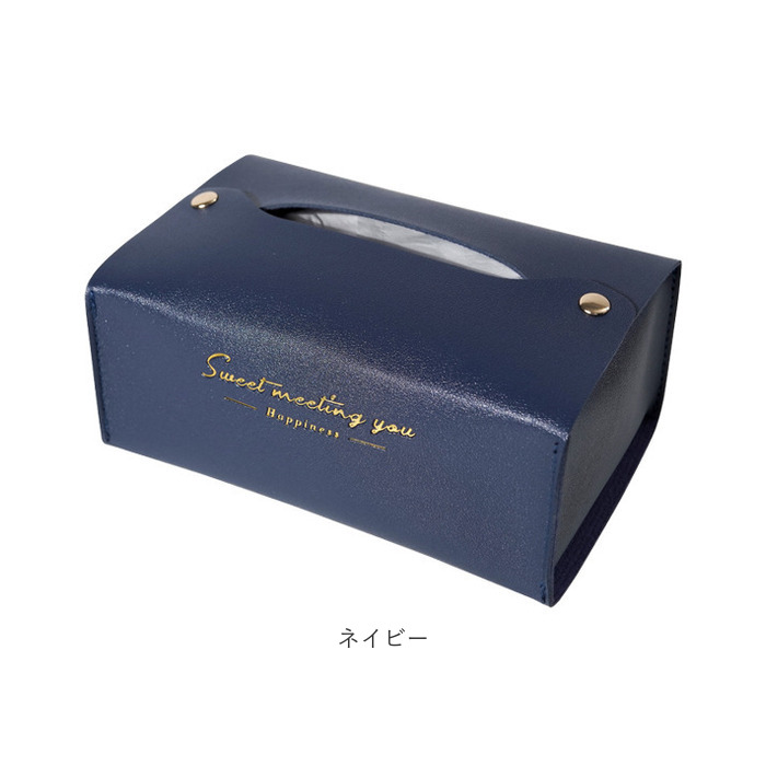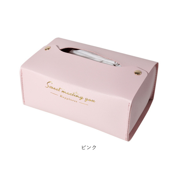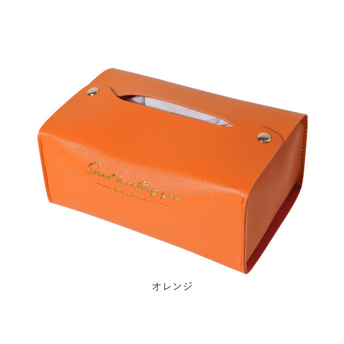 | ・ティッシュボックスをオシャレに着せ替え!インテリアのアクセントになる「ティッシュカバー」が新登場。 【小ぶりなボックスフォルム】 ・折りたたまれた状態のカバーを広げて側面の生地を立てたら、パチンッとスナップボタンを留めるだけ!ちょこんと小ぶりなボックスフォルムが可愛い♪ 【詰め替え作業が楽ちん】 ・開口部は開け閉めがスムーズにできるスナップボタンタイプ。上からティッシュペーパーのリフィルをポンッと収納するだけで、詰め替え作業が完了!(※ボックスタイプのティッシュはそのまま収納できません。箱から詰め替えてご使用になるか、ソフトパックタイプのティッシュのご利用をお勧めします。) 【手軽に置けて、省スペース】 ・ドレッサーの上や洗面化粧台キャビネットの中、自動車のダッシュボードなど、手狭な場所にも気軽におけるコンパクトサイズ。 【汚れはサッとひと拭き】 ・ケースの生地には軽量で汚れや水滴に強いフェイクレザー素材を使用。汚れが気になったら、水拭きでサッとOFFできるからお手入れも手間いらず。 【インテリアに映えるデザイン】 ・カラフルなフェイクレザー生地に、ゴールドで箔押しした「Sweet Meeting You」のセンテンスがワンポイント。カバーを変えるだけで、生活感が出てしまいがちなティッシュがグッとエレガントに♪ |