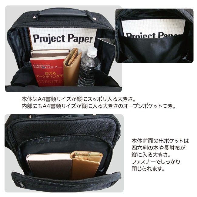 仕様説明 ・前面かぶせにファスナーポケット、 かぶせ下にオープンポケット付き ・本体内部にオープンポケット付き ・背面ファスナーポケット付き