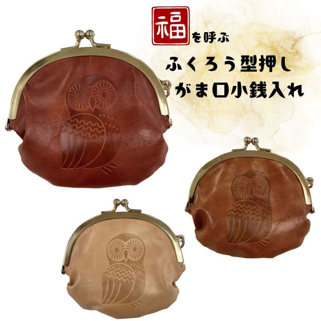 縁起の良いフクロウの型押しがされたがま口小銭入れ