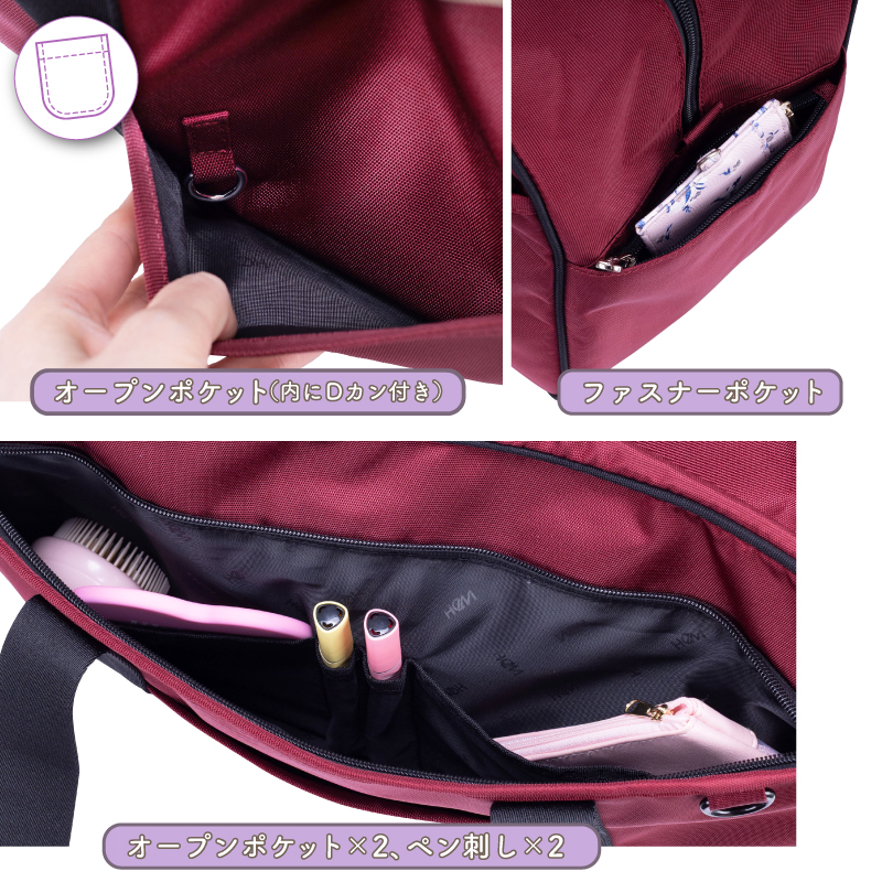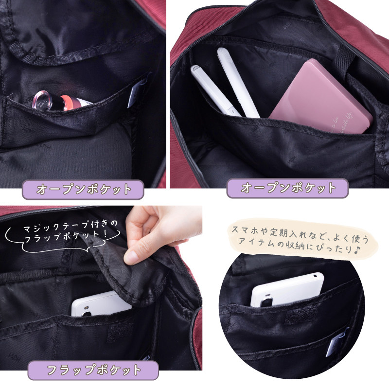 ポケット:【外側】オープンポケット×1、サイドファスナーポケット×1、ファスナーポケット×1(オープンポケット×2、ペンポケット×2)