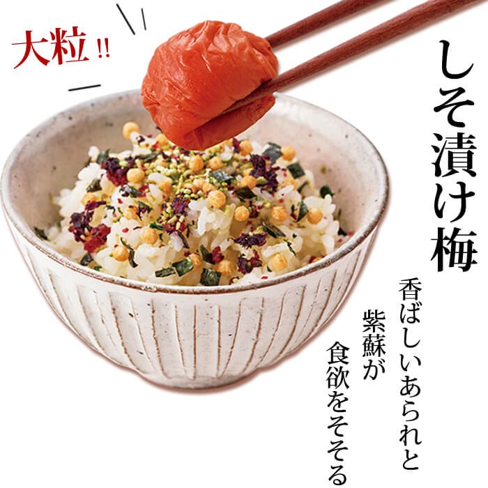 【調味梅干】梅(紀州)、しそ、漬け原材料(還元水飴、食塩、しそ液、発酵調味料、醸造酢、煮干しエキス、昆布エキス)/野菜色素、ビタミンB1
