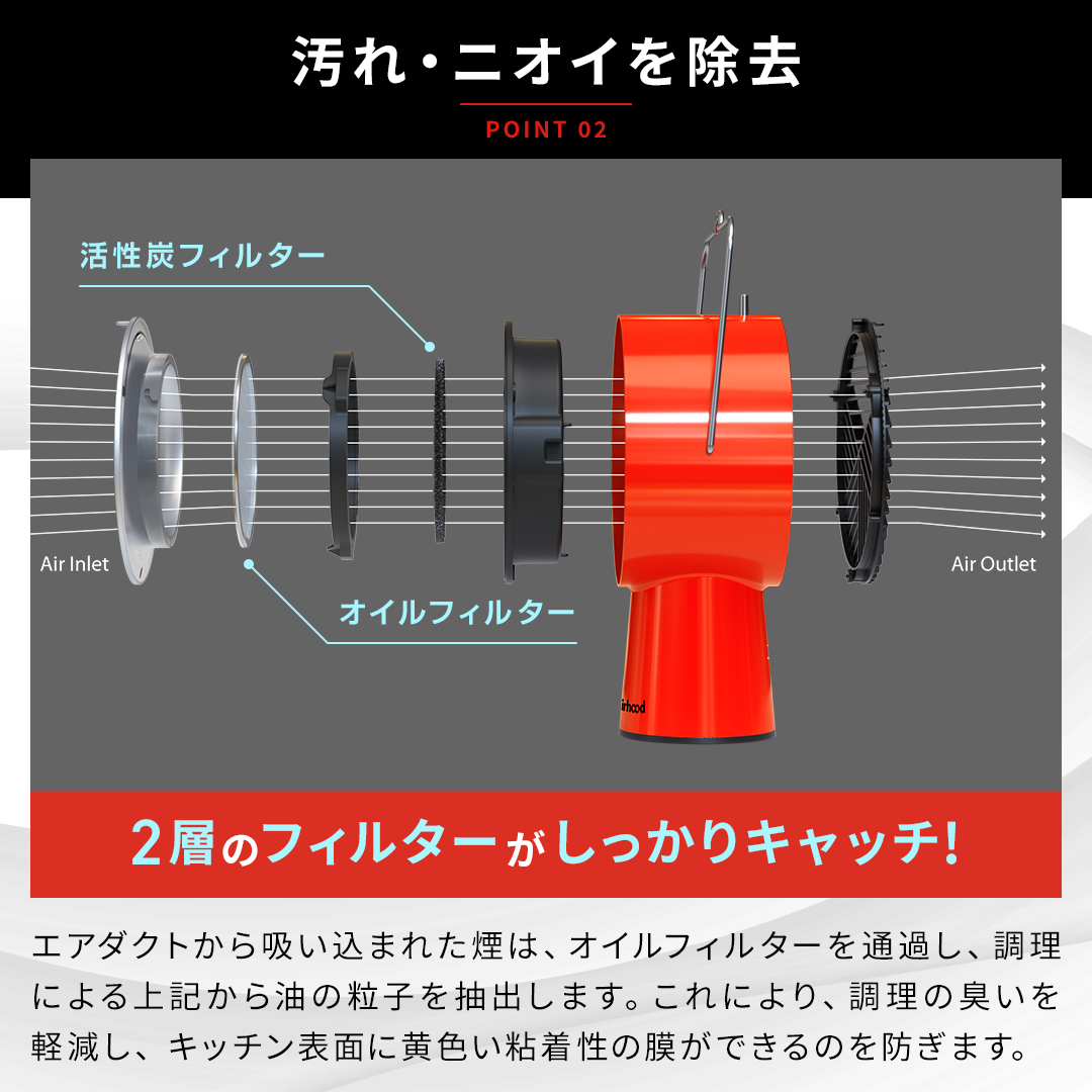 エアフードは油、煙、調理臭を発生時に低減し、表面に油膜ができるのを防ぐポータブルレンジフードです。