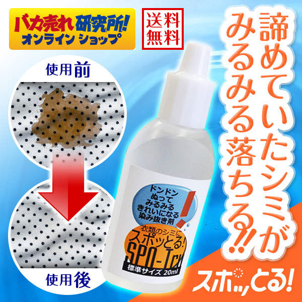 楽天総合ランキング1位受賞!販売実績20万個突破!洗濯洗剤や漂白剤で落ちなかった汚れがみるみる落ちる!クリーニング店で15年間研究された染み抜き剤「スポッとる」。酵素の力で生地を傷めずシミを分解除去!その驚きの効果にTVでも大絶賛!