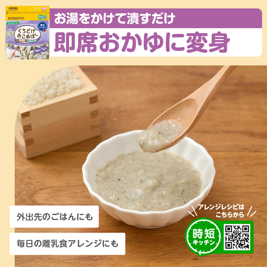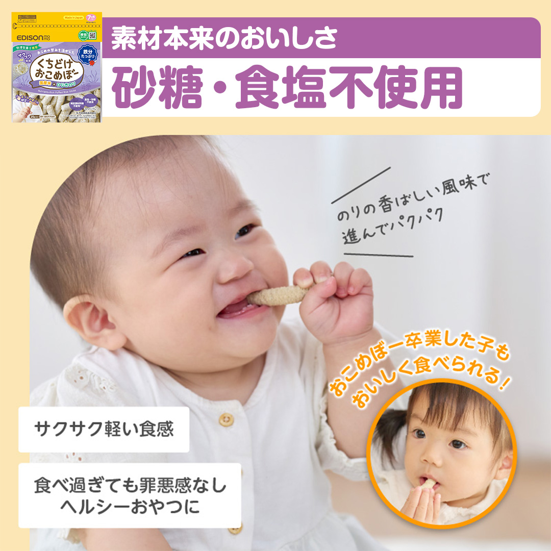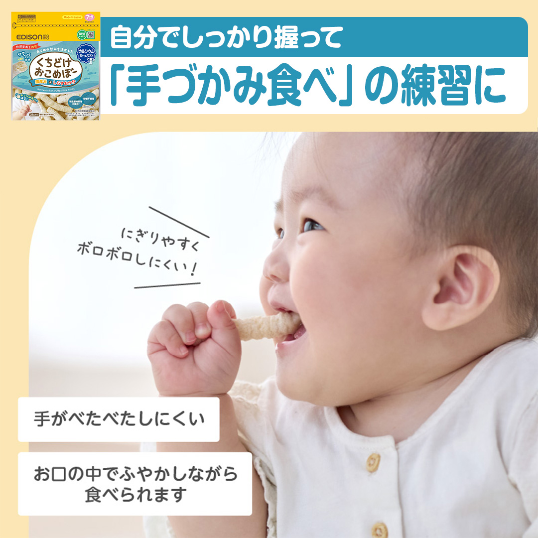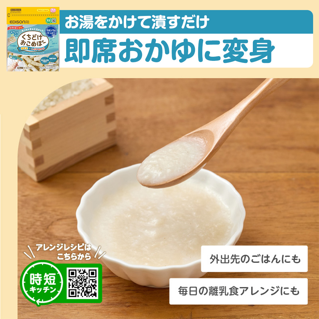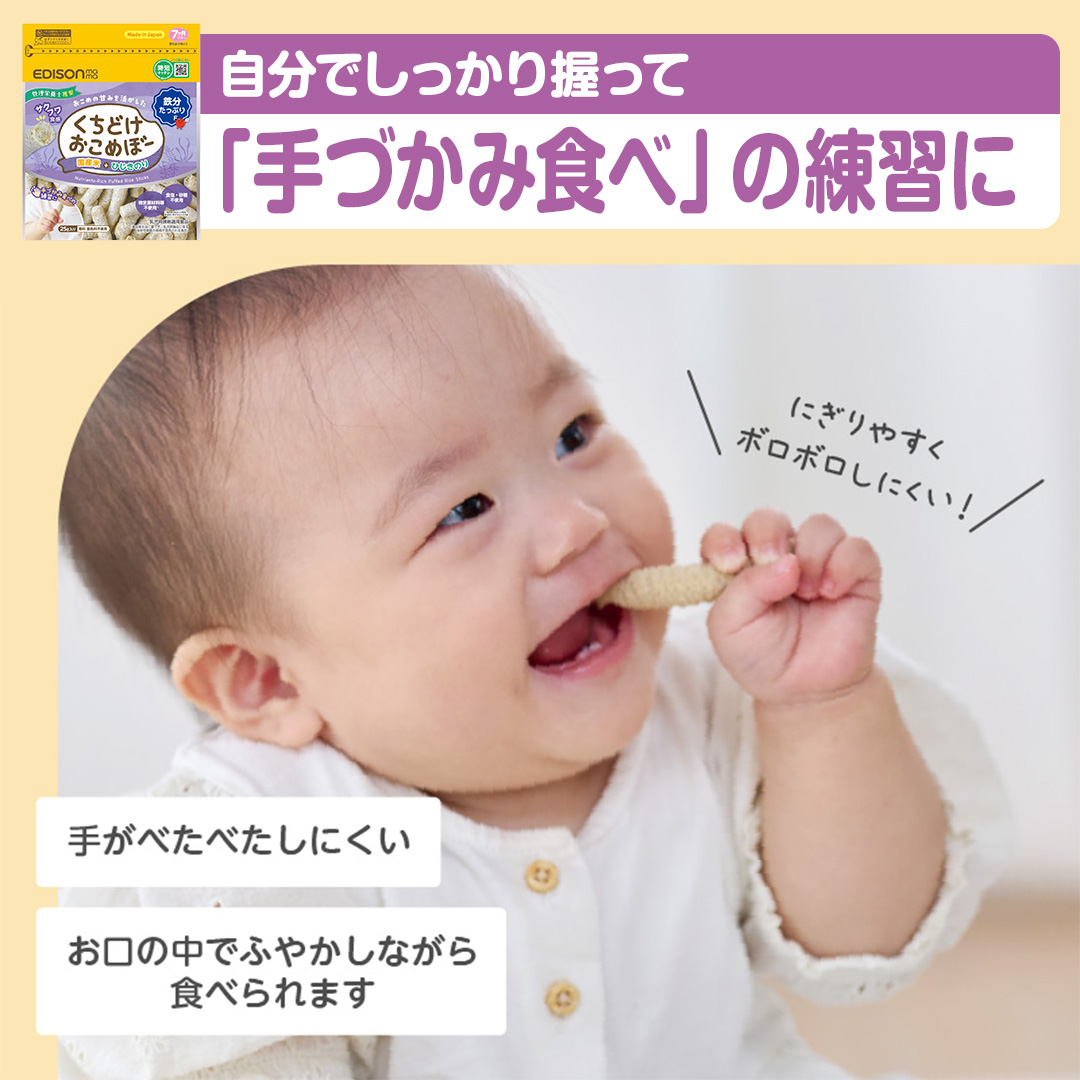 赤ちゃんがにぎりやすいスティック形状でそのまま食べても、溶かしておかゆにしても美味しいおせんべいです。