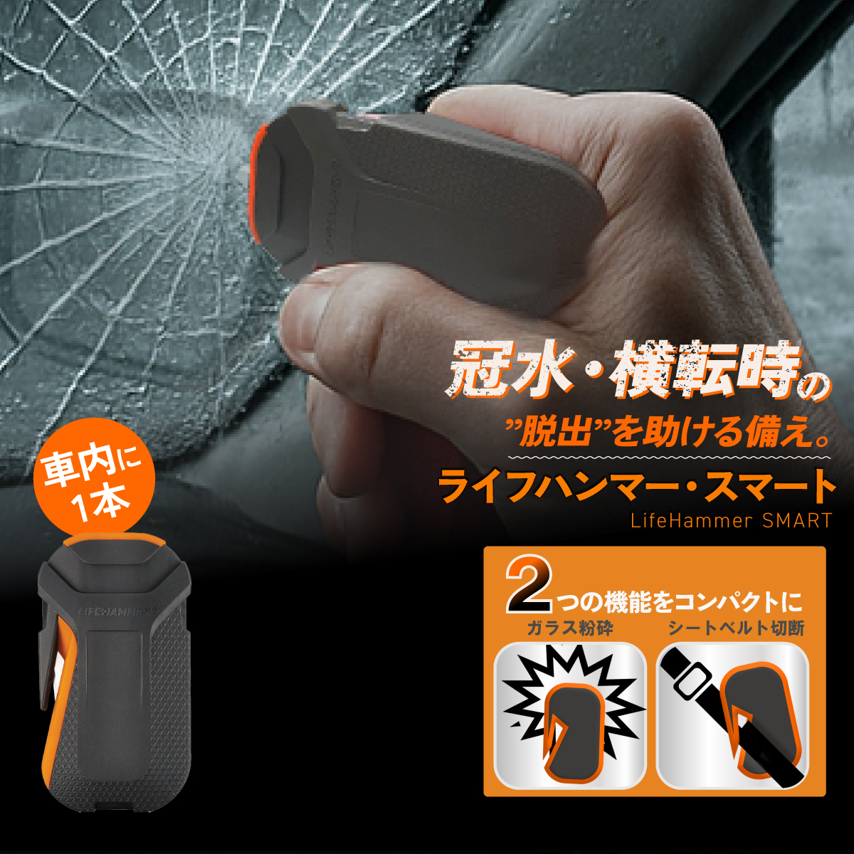 緊急脱出用ハンマー 車 ライフハンマー・スマートレスキュー 車用 車載 水没 水害対策 シートベルトカッター付