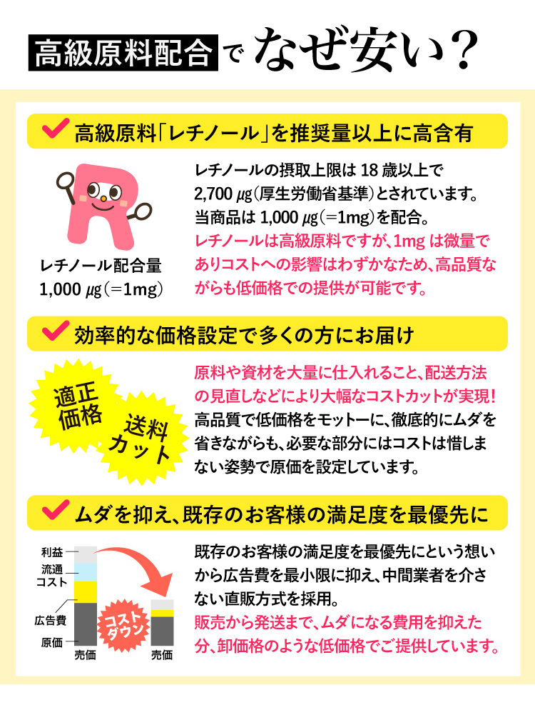 | 原材料名 | ウコンエキス(インド製造)/ビタミンC、セルロース、ステアリン酸カルシウム、HPC、微粒二酸化ケイ素、ビタミンB2、加工デンプン、ビタミンA、ヒマワリレシチン、パントテン酸カルシウム |