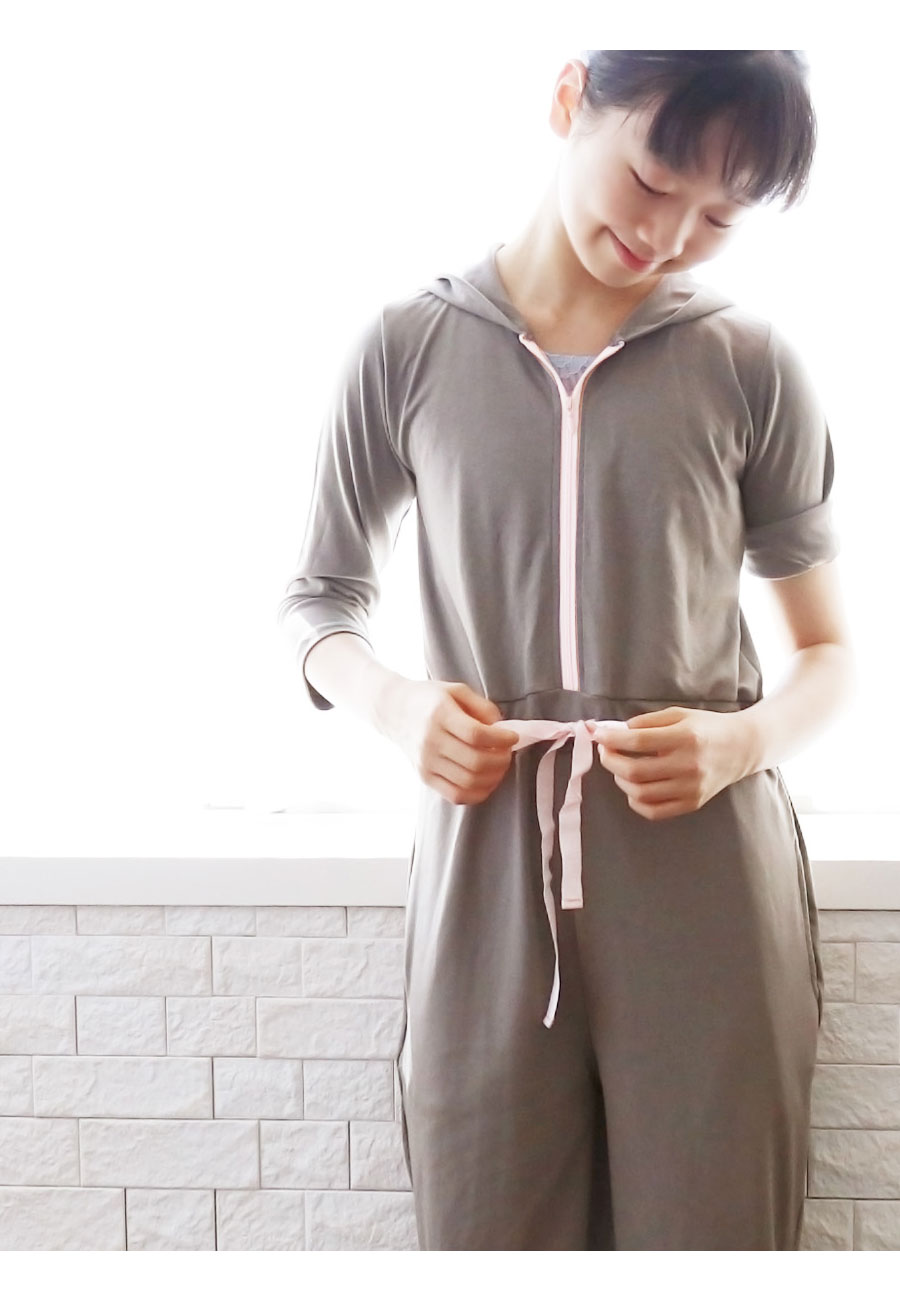 もたつきがちなサロペットをウエストゴム+伸縮性のあるドローコードでキュっと締められるので、シルエットも綺麗に着られます。