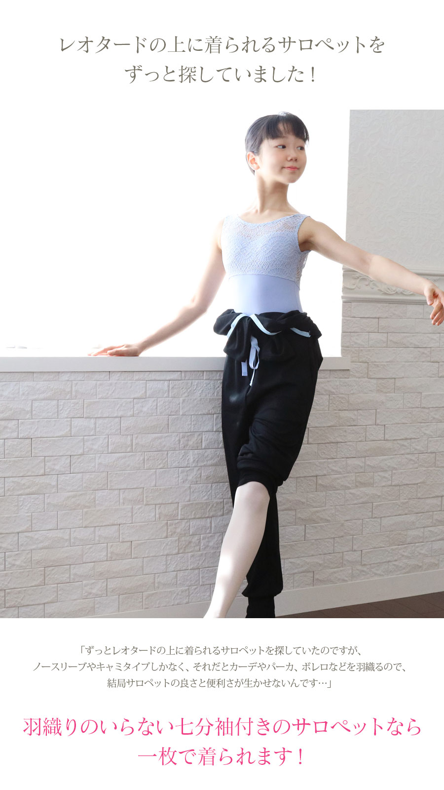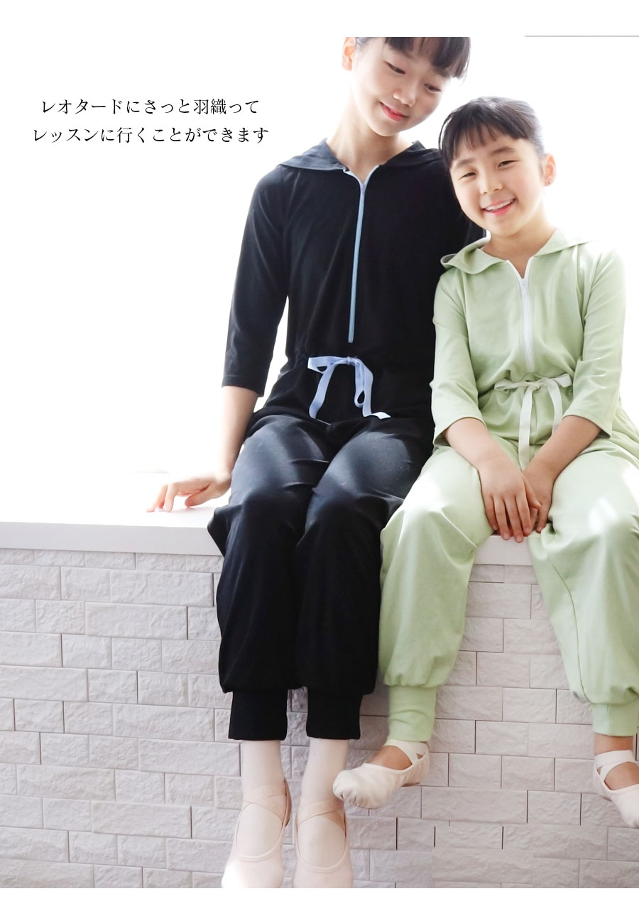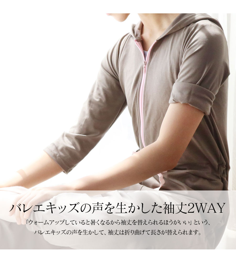 ⇒袖丈はバレエキッズの意見を生かして、七分袖〜半袖に変えられる2WAY袖にしました!また上半身を脱いで、ウエストで調整すればパンツのようにも着られて便利です。