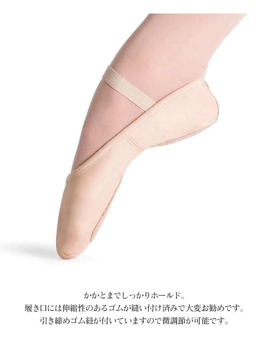 足裏をしっかり鍛えてくれるフルソールタイプ。履くほどに足になじむレザー素材のバレエシューズで動きやすく安定感があります。柔らかいインソールでグリップもしっかり。つま先の伸ばしやすさに加えて、ターンがしやすいのも特徴です。成長の早いお子様の足にも適応期間が長めな上、紐の調節が可能ですのでグイッと引っ張って一番なじむ締め付け感で使用することが出来ます。