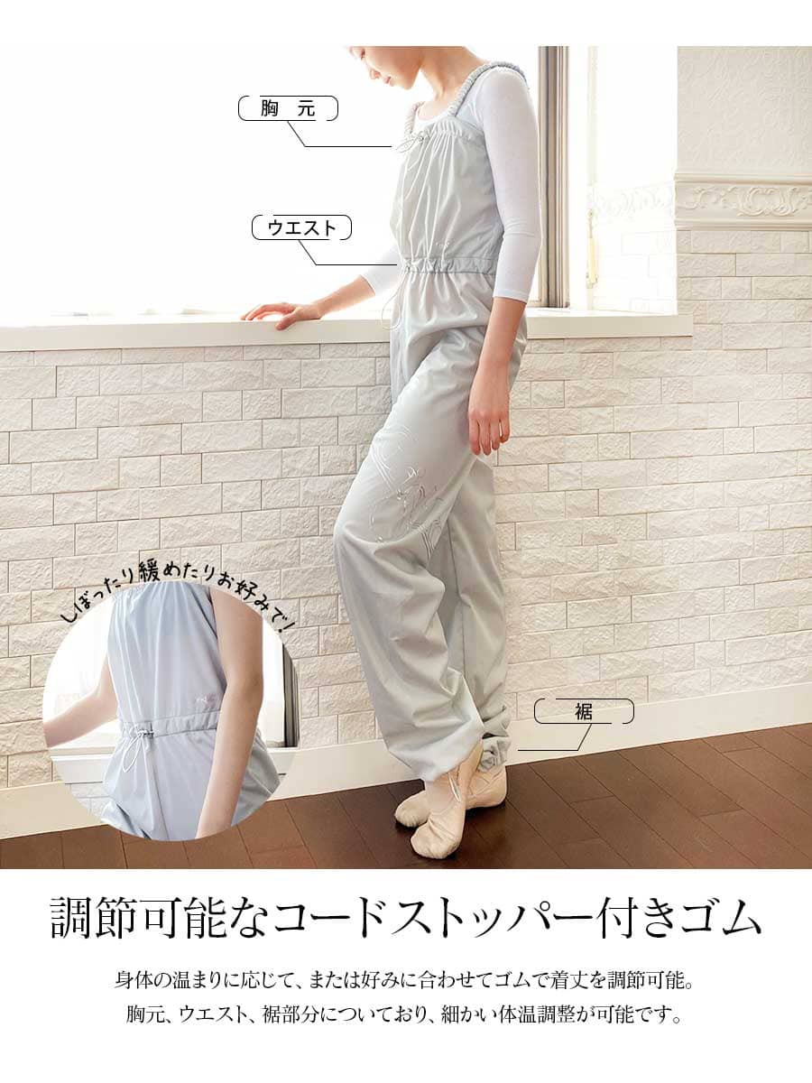 胸元、ウエスト、裾部分にあるコードストッパー付きのゴムで自由に調整可能。