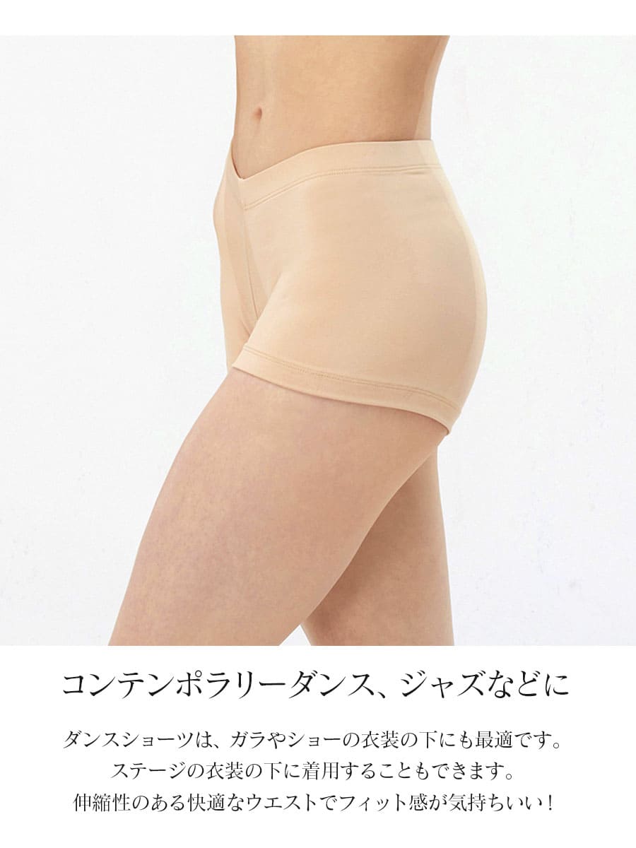 ダンスショーツは、ガラやショーの衣装の下にも最適です。ステージの衣装の下に着用することもできます。伸縮性のある快適なウエストでフィット感が気持ちいい。マチに同色の裏地付き。