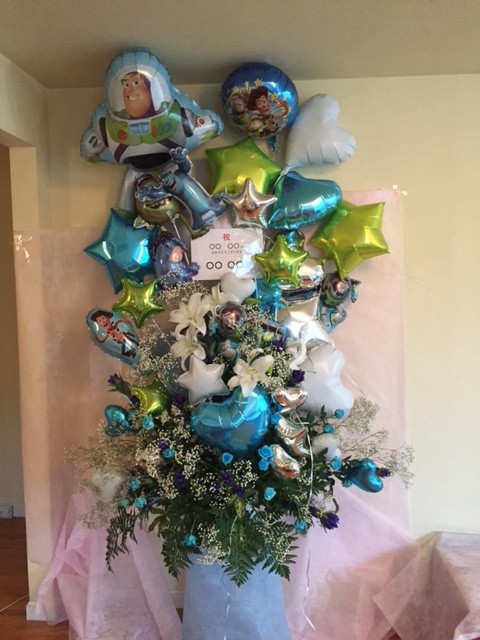 めずらしい生花とバルーンのスタンド花トイストーリー モンスターズインクスタンド花 高さ250センチ全体の高さ250cmくらい 札付き札のメッセージをコメント欄にご記入下さいお花は東京の大田市場で良いお花を選びます季節によって花が変る事はありますが色やイメージは変わらないようにしています
