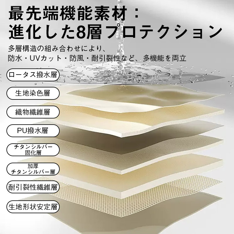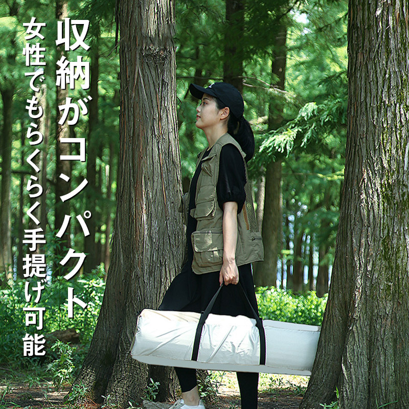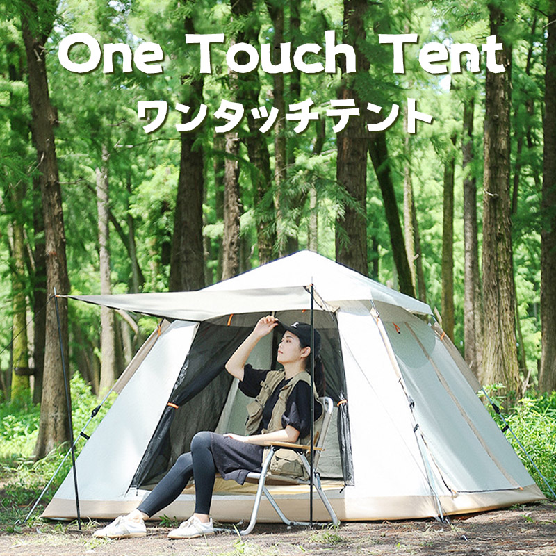 テントの生地には耐水圧の撥水素材を使用。急な天候の変化にも慌てない!小雨程度なら問題なく使用できる防水性能です。ワンタッチ式でどなたでも簡単で設営できます。