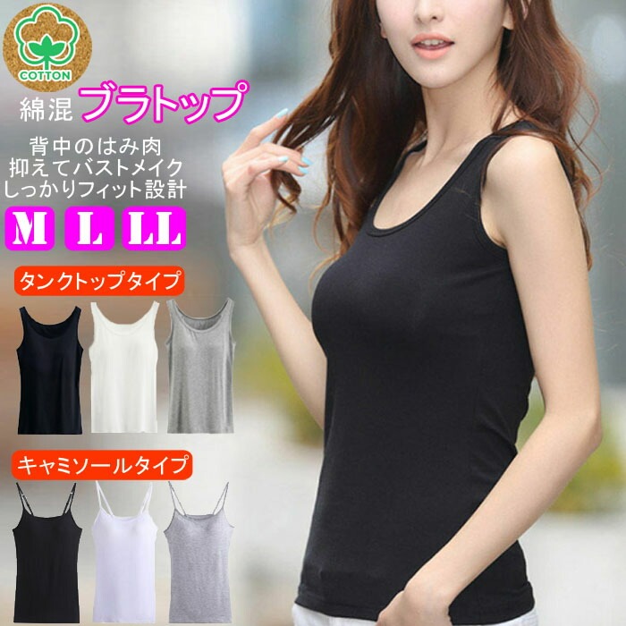 ブラトップ 綿混 カップ付きインナー コットン タンクトップ キャミソール インナー 肌着 白 黒 グレー 大きいサイズ M L LL 10代 20代 30代 40代 50代 60代 BANANA バナナ レディースファッション おしゃれ きれいめ 灰色 ノースリーブ キャミ 無地 カップ付き シンプル ブラキャミ パット アンダーゴム ホールド ストレッチ 美胸 オールシーズン 夏 夏用 肩ひも調整