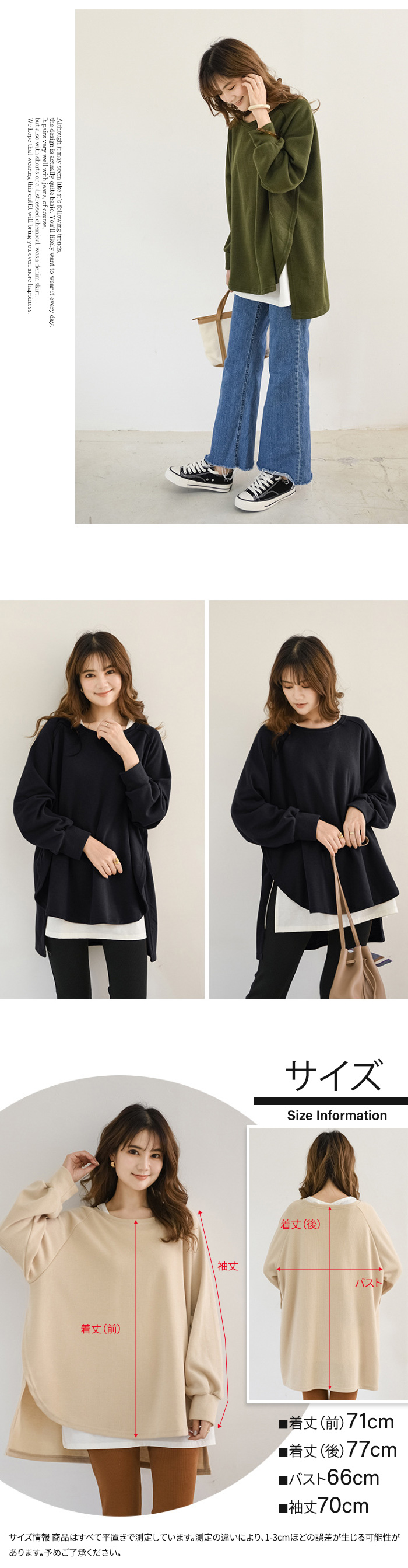 フリー = 着丈(前)71、 着丈(前)77、バスト66cm、袖丈70