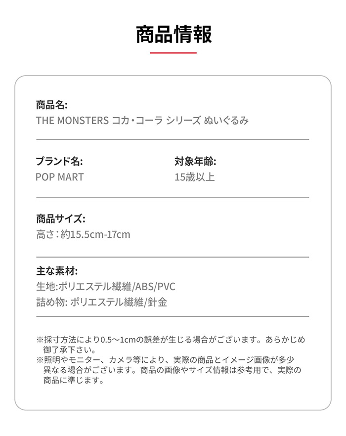 | ラブブ ぬいぐるみ 【正規品】Labubu THE MONSTERS COCA COLAシリーズ ぬいぐるみ POP MARTの大人気キャラクター「LABUBU(ラブブ)」とコカ・コーラの夢のコラボシリーズ! 甘いコカ・コーラにときめく可愛いラブブをぜひGETしてください♪ 【ITEM】 ・Happy Factor ・Surprise Shake シークレット ・Mysterious Guest | |
