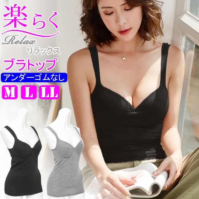 締め付けない アンダーフリー ブラトップ 綿混 コットン 楽らく カップ付きインナー アンダーゴム なし きれいめ インナー 肌着 黒 グレー