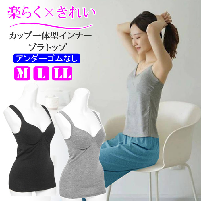 ブラトップ 綿混 コットン カップ付きインナー 締め付けない 楽らく 一体型 アンダーゴム なし きれいめ インナー 肌着 ブラキャミ スポーツブラ 黒 グレー