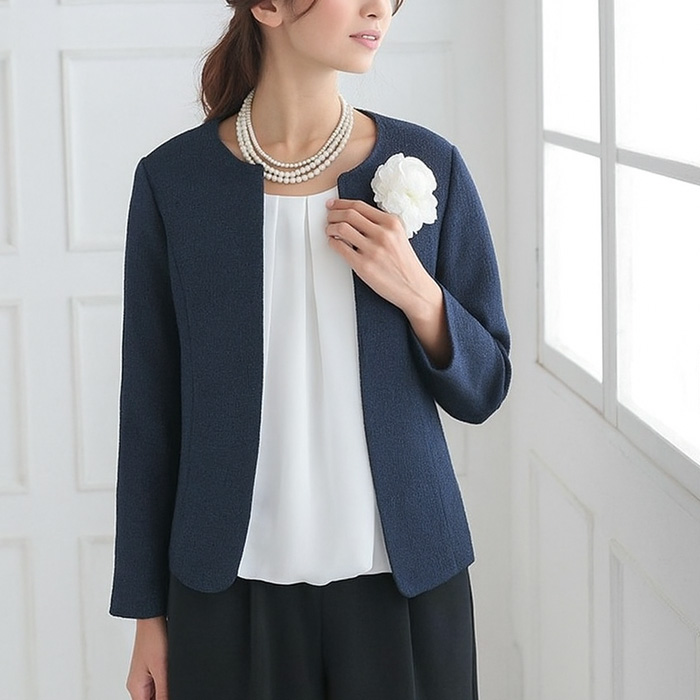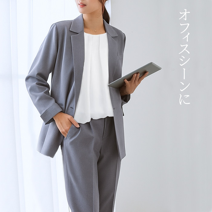 ●いつものスーツのインナーを変えるだけでスッキリ上品コーデが完成。