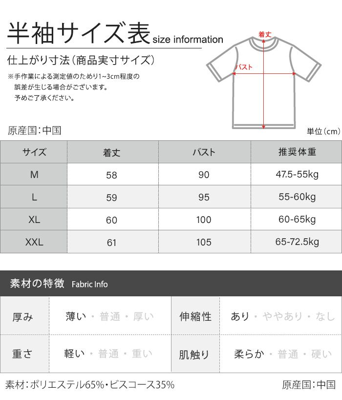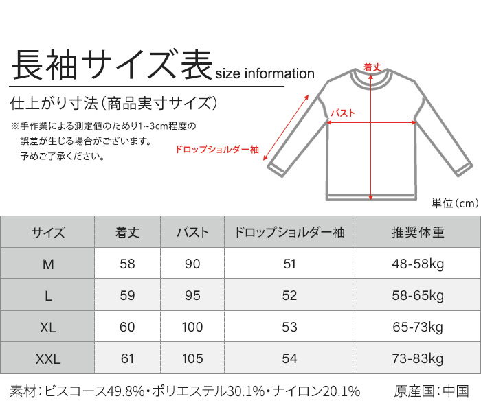 XL = 着丈60、バスト100、 ドロップショルダー袖53、推奨体重65-73kg