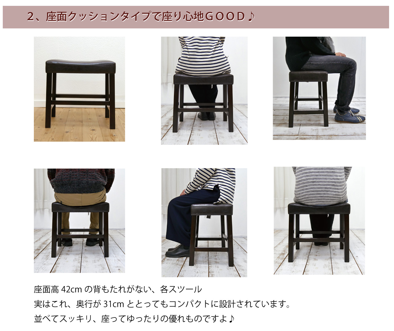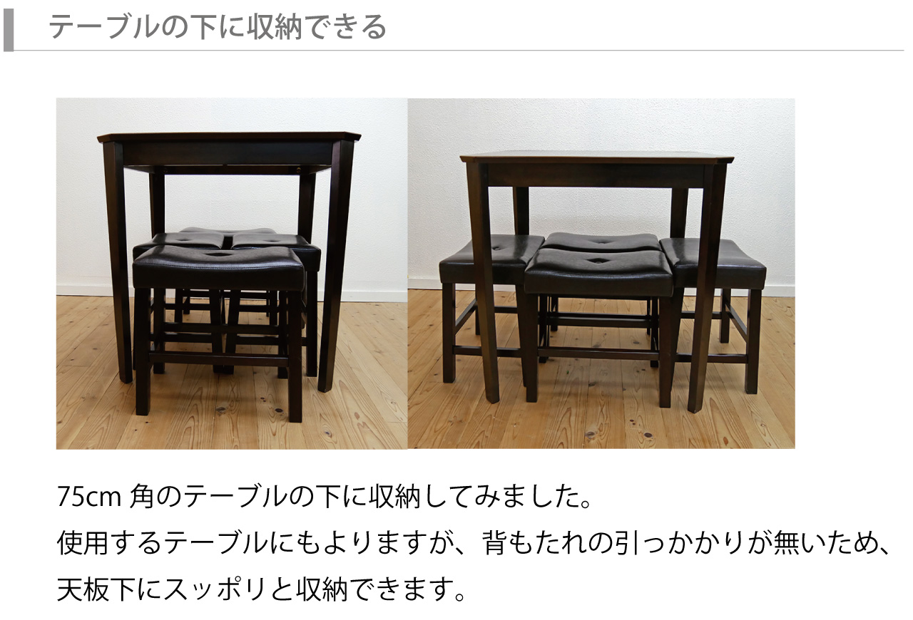 | 素材 | 座面:ソフトレザー(合成皮革)張り、ウレタンフォーム フレーム:ラバーウッド |