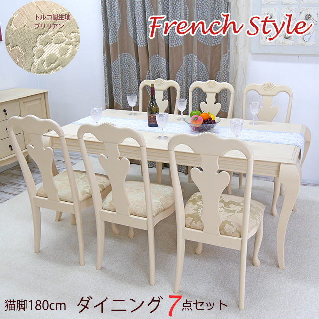 | ゆるやかな優美な曲線と かわいらしい猫脚デザイン クィーンアン様式のアイボリーダイニングテーブル。猫脚とさりげない曲線を用いたデザインが、フレンチスタイルのクラシック感を高めています♪ ご家庭用の幅180cmの6人〜10人用食卓テーブルとして便利にお使い頂けます。(脚と合わせたテーブル巾は188cm) また、カフェ、ネイルサロン、美容室、フットケア等店舗業務用・接客テーブルとしても人気! 輸入雑貨や服飾店などの店舗用展示台・デイスプレイテーブル・商品陳列台としても大変好評! テーブルの角が丸くなっているので、当たっても痛くなく安全♪ |