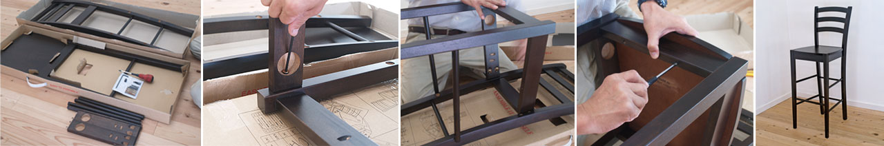 | 組立式の木製チェアですが、組立用ビスなどの金属部分は外側からは見えないすっきりとしたシンプルなデザインになっています。その為に安っぽい印象がなく、カフェバーやレストランバーなどハイカウンターご使用の飲食店など店舗用にも好評♪ |