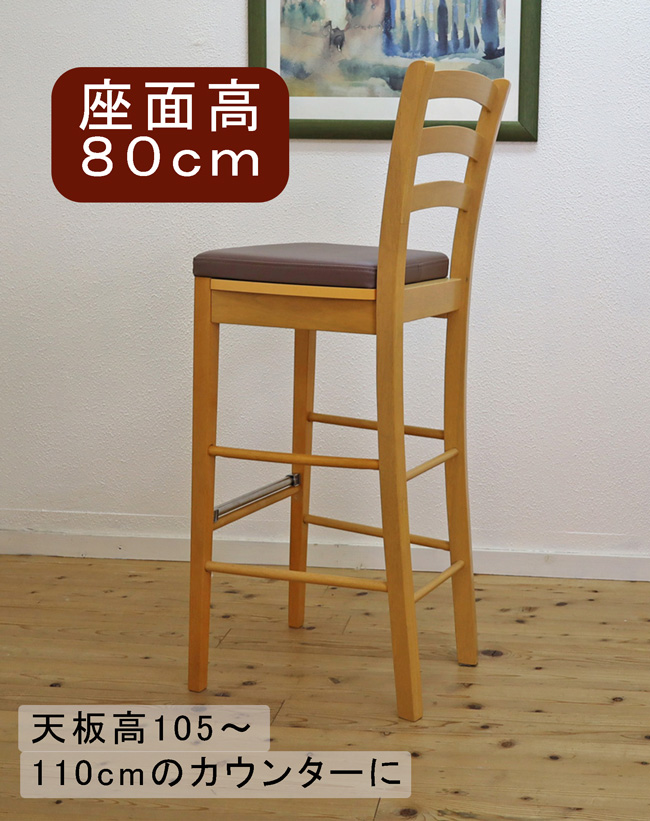 木製 ハイカウンター チェア 座面80cm 補強桟有り CCK409-80 ナチュラル色 業務用 カウンター110cmに合う椅子