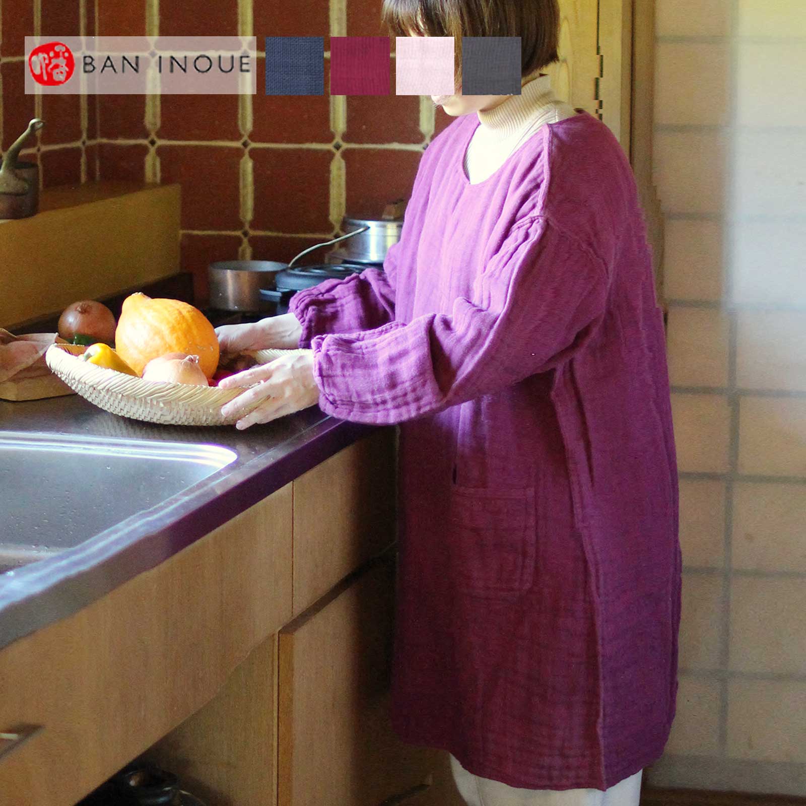 着心地が柔らかで軽い、プルオーバータイプのストレスフリーな割烹着(かっぽうぎ)。綿100%の蚊帳生地を贅沢に4枚重ねて、ふんわりと厚みをもたせました。
