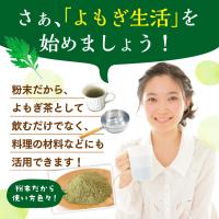 ◆よもぎの力で健康作り!ヨモギ 50g粉末タイプです。今、見直される「よもぎパワー」昔ながらの健康茶と言えば「よもぎ茶」 里山からの自然の恵みが あなたの健康作りをサポートします。万象堂では徳島県産の農薬を使わず栽培した「よもぎ」を粉末にしました。◆なんとも言えないヨモギの香りです!ホットでも冷やしてもどうぞ!夏場は冷やして、冬場はホットな「よもぎ茶」を健康管理にお役立て下さい。粉末なのでお湯を注ぐだけ簡単便利。◆よもぎの効能・自然の力食物繊維も豊富でダイエット効果も期待できます。また、ヨモギの若草の香り成分は「シネオール」という香り成分で、気分をリラックスさせてくれる働きなどがあります。ヨモギに豊富に含まれている不溶性食物繊維はダイエット効果が期待できます。ヨモギに含まれるクロロフィルはたくさんの健康効果が実証されています。また、よもぎは、カロテンを含み、βカロテンは高い健康効果で知られていますが、食用以外での効用も沢山あります。ヨモギにはさわやかな若草の香り、アロマ効果が期待できます。香り成分はユーカリプトールとも呼ばれる「シネオール成分」などで、気分をリラックスさせてくれる働きなどがあります。◆こんなあなたに特におすすめ!自然の健康茶で健康維持に取り組みたい方なんだか、体調がすっきりしない方野菜不足が気になる方寒さに弱い方ついつい食べ過ぎてしまうという方自然の健康茶で健康維持に励みたい方よもぎ茶の一杯と、バランスの良い食事や運動を心がけ、健康維持に励みましょう!◆よもぎ料理に挑戦してみませんか?万象堂では管理栄養士の先生と共同でよもぎの粉末を使った「よもぎ料理のレシピ集」を作成しました。レシピの数は12種類で盛りだくさん。現在、初回限定で「よもぎの粉末」をお買い上げのお客様に無料で配布しています。飲むだけでなく、お菓子作りにお料理に「よもぎの粉末」をご活用ください。◆原料 徳島県産 よもぎ100% ※アクヌキせずに粉末化しています。残留農薬検査済・106項目不検出◆栄養成分100g当たり(推定値)2020年10月分析エネルギ―246 kcal たんぱく質 8.2g炭水化物80.5g(糖質13.6g 食物繊維66.9g)ナトリウム 5mg 水分2.3g 灰分6.2g ビタミンK880mg総クロロフィル 53.2mg 1.8シネオール(香り成分)0.7ppm※森羅万象堂で実際販売している「よもぎ茶50g」の分析値です。◆「よもぎ」は収穫時の天候、畑の水はけなどの理由で、色が薄かったり濃くなったり変動します。粘り気も差があります。自然の農産物ですのでご了承ください。添加物等一切ありません。時間の経過ともにお茶は色落ちします。ご了承下さいませ。"