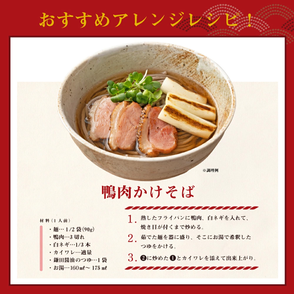 | 【麺】小麦粉(国内製造)、そば粉、食塩/酒精、pH 調整剤、加工でん粉、(一部に小麦・そばを含む) 【そばつゆ】しょうゆ(国内製造)、砂糖、食塩、かつお調味エキス、果糖、酵母エキス、煮干いわし調味エキス、かつお節エキス/調味料(アミノ酸等)、アルコール、カラメル色素、(一部に小麦・大豆を含む) | |
