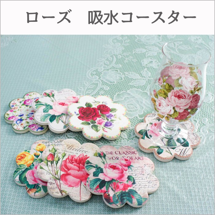 コースター 吸水 ローズ クラシック 花形 テラコッタ陶器 北欧柄 ポップ かわいい
