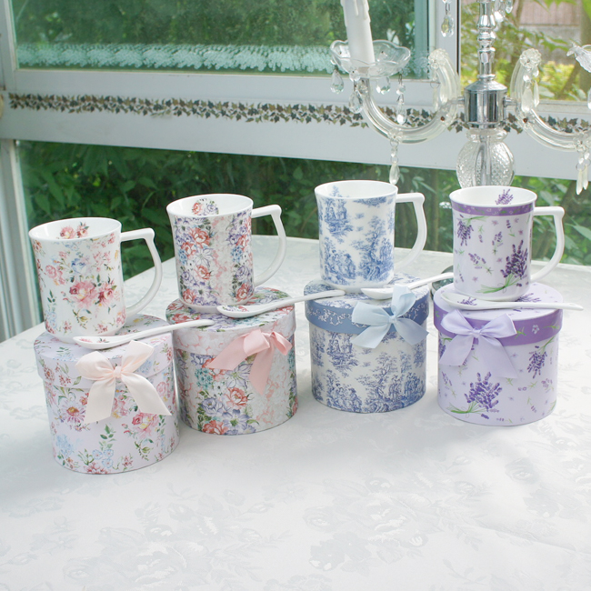 人気のボックス入りマグカップに、スプーン付きのデザインが入荷致しました。ロマンチックなローズ系の柄や、クラシカルなトワルドジュイ柄、人気のラベンダー柄などからお選び頂けます。ギフトにはもちろん、ご自宅用にも是非どうぞ。■サイズ:直径約8cm 高さ約9.5cm 取って含む幅約11cm■容量:約250ml■素材:ニューボーンチャイナ■原産国:中国■電子レンジ対応※製造上、黒い点や凹凸、細かな傷、プリントのズレ、気泡が見られる場合がございますが、不良ではございませんのでご了承の上お求め頂けますようお願い致します。