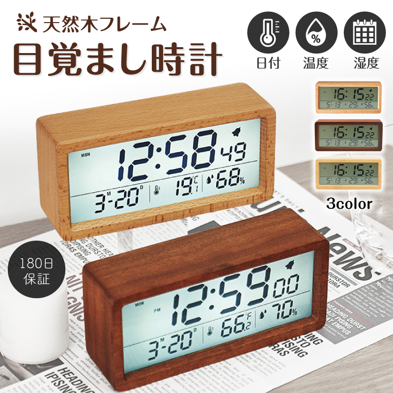 置き時計 おしゃれ 北欧 木製 デジタル 温度計 湿度計 目覚まし時計 リビング 置時計
