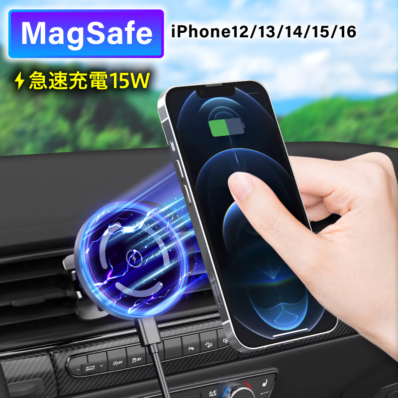快適なドライブのお供に!MagSafe対応ワイヤレス車載ホルダーで、充電も操作もスムーズに。