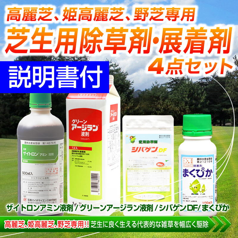 芝生用除草剤・展着剤4点セット 高麗芝 姫高麗芝 野芝専用 ザイトロンアミン液剤・グリーンアージラン液剤・シバゲンDF・まくぴか