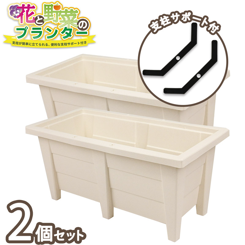 花と野菜のプランター 60cm ホワイト 2個セット 支柱サポート付き 28L 家庭菜園 ガーデニング 野菜 花 長方形