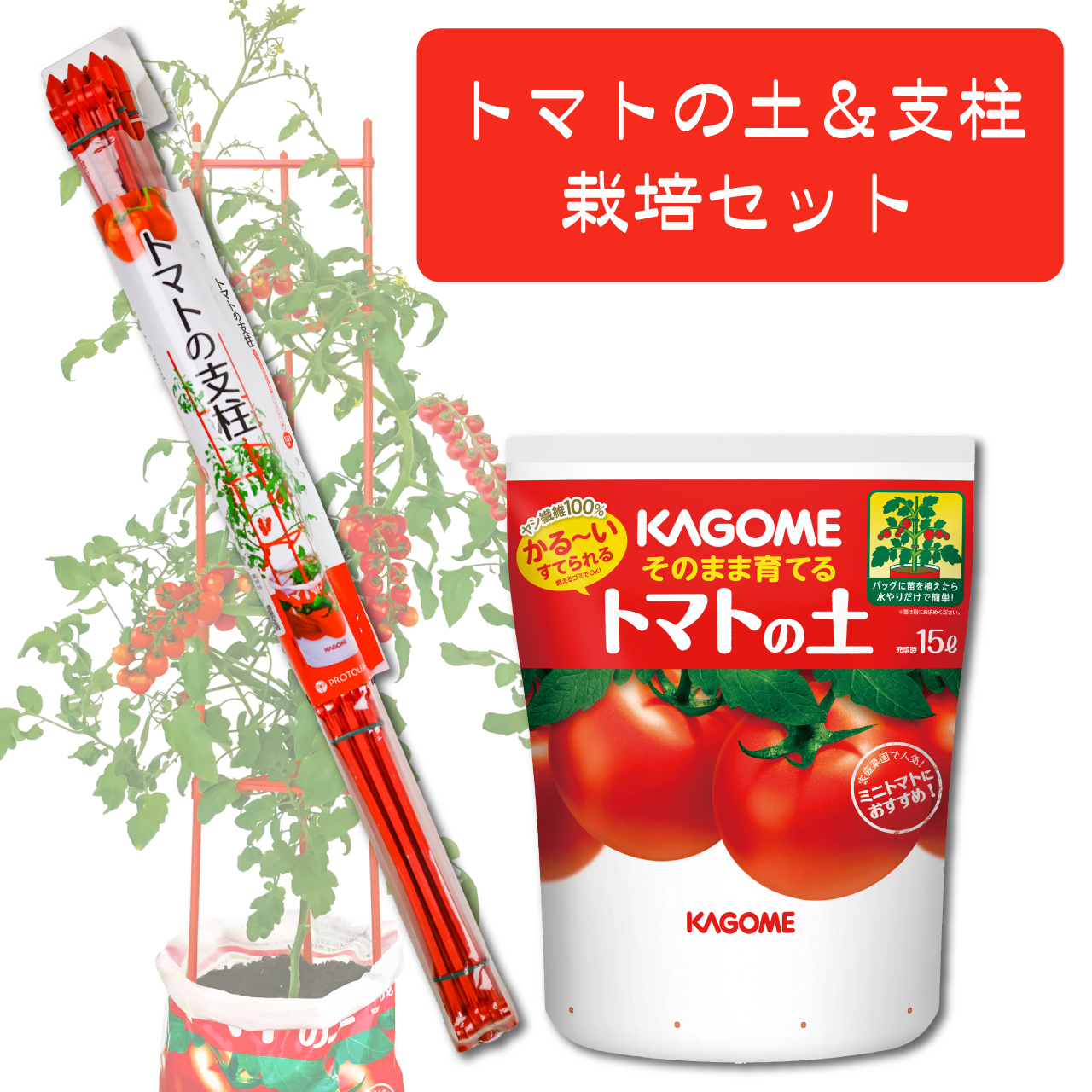 プロトリーフ カゴメ そのまま育てるトマトの土 15L | プロトリーフ トマトの支柱 120cm |