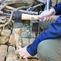 片手で扱えるサイズ感と鋭さが長続きする炭素鋼刃で簡単に薪割りが可能に。