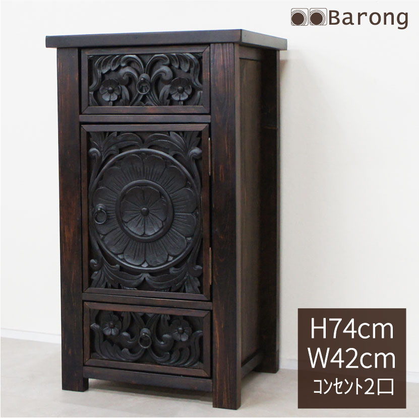 アジアンナイトテーブル アジアンサイドテーブル チェスト キャビネット 収納付き コンセント付 おしゃれ 天然木 バリ島レリーフ アジアン家具 H74cm W42cm