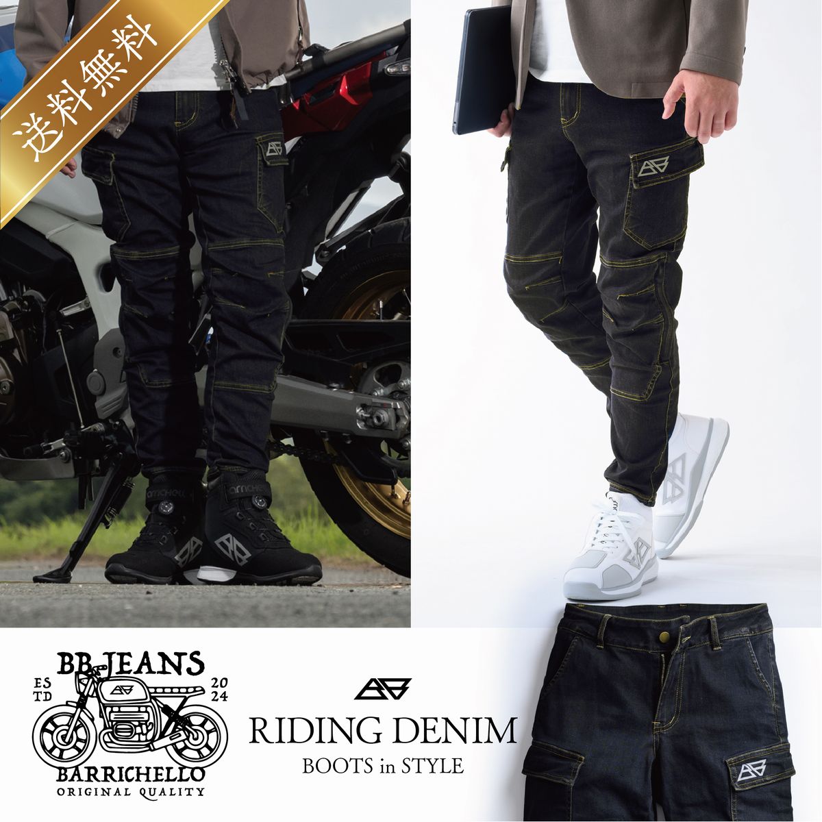 Barrichello(バリチェロ) ライディングパンツ バイク用 BBデニム 膝プロテクター付属 春夏秋向け ストレッチ素材 ブラック