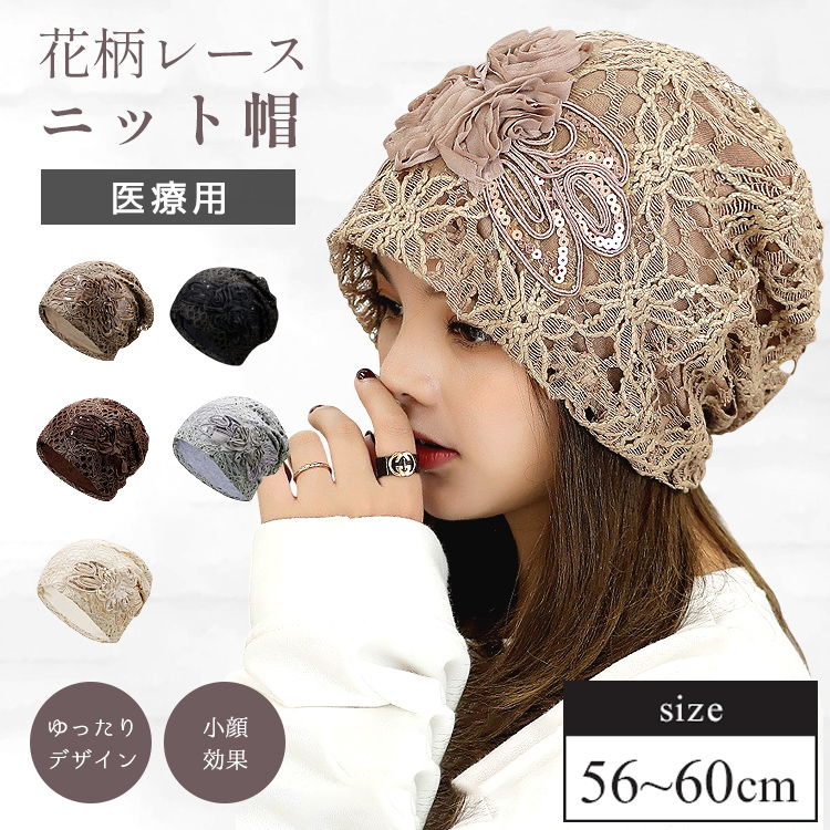 【フロントの大きな花柄が可愛い♪医療用 花柄レース ニット帽】医療用でいながらフロントの花柄がおしゃれなレースニット帽です