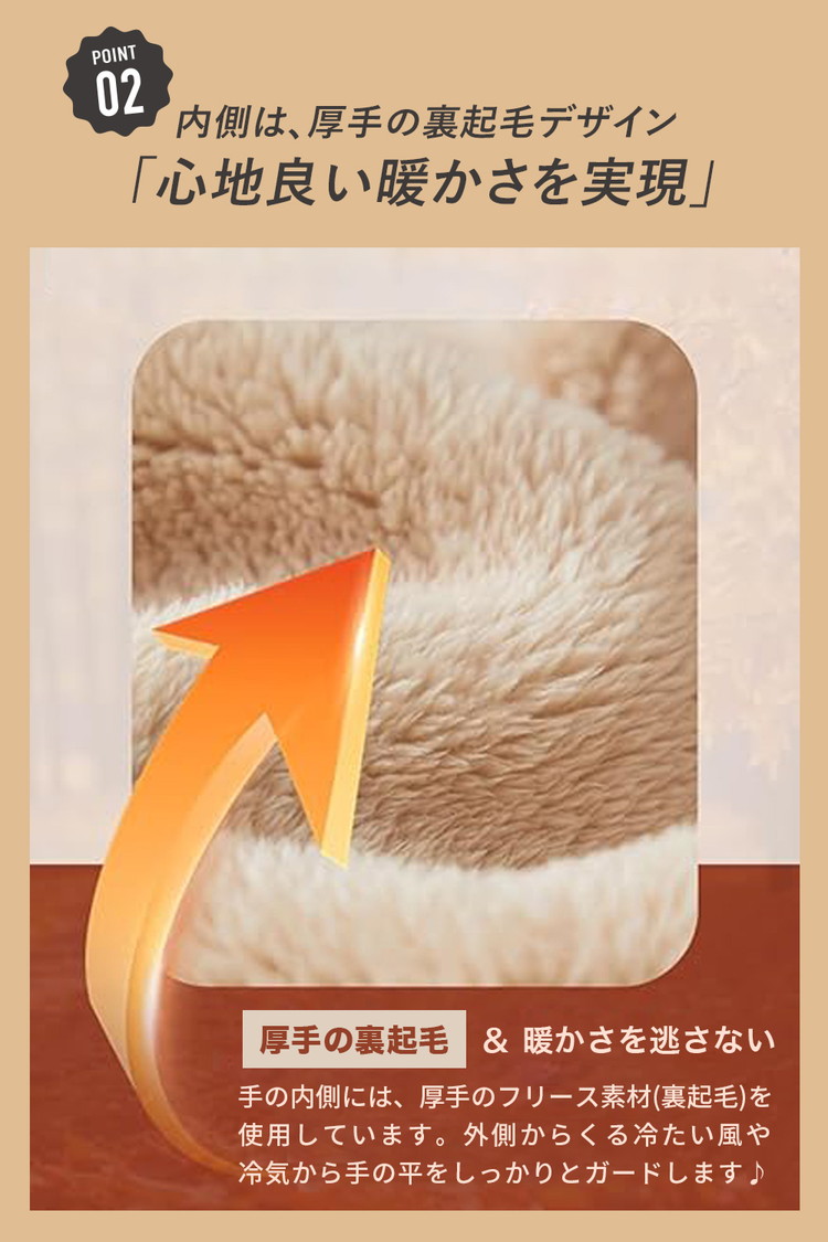 指先から手首まで裏起毛があり、冷たい風からしっかり守ります