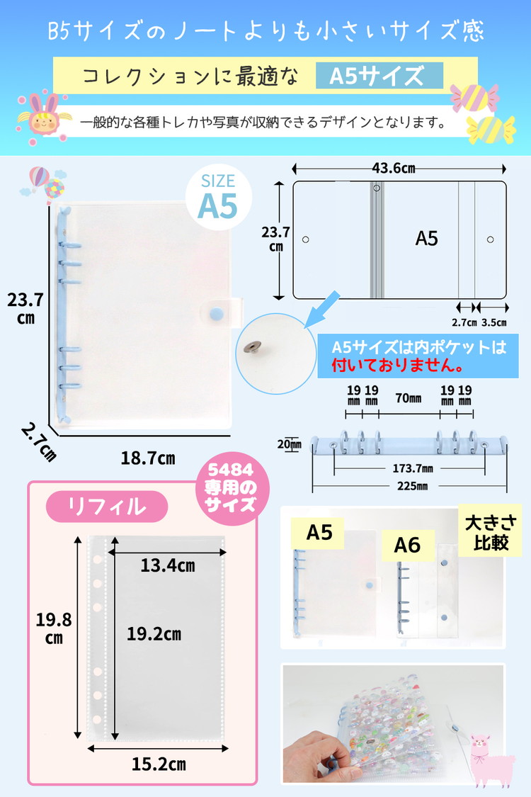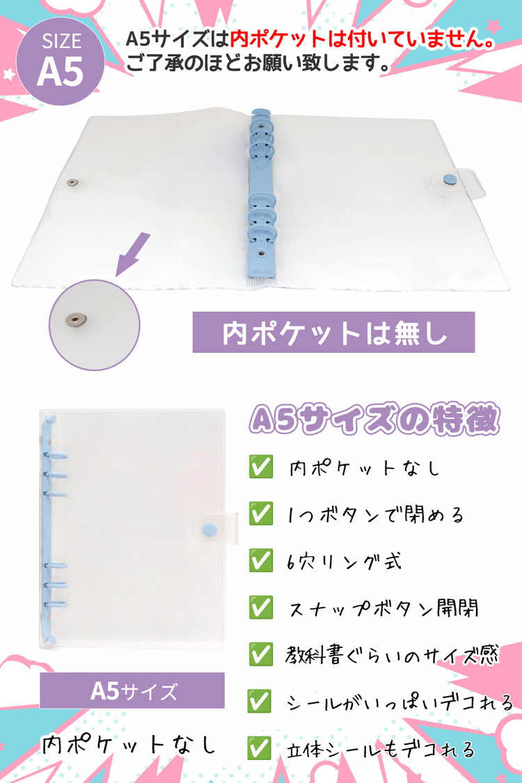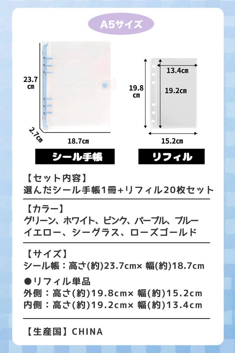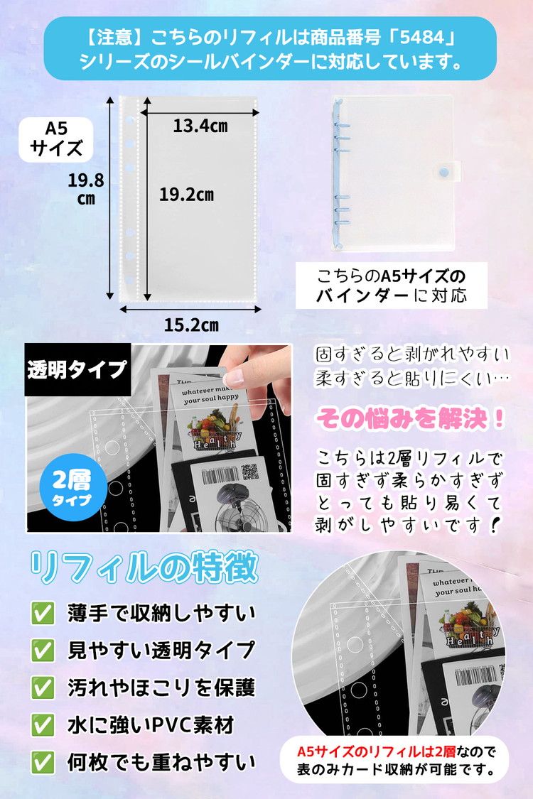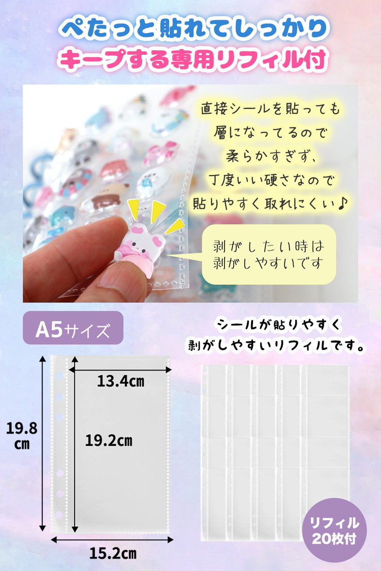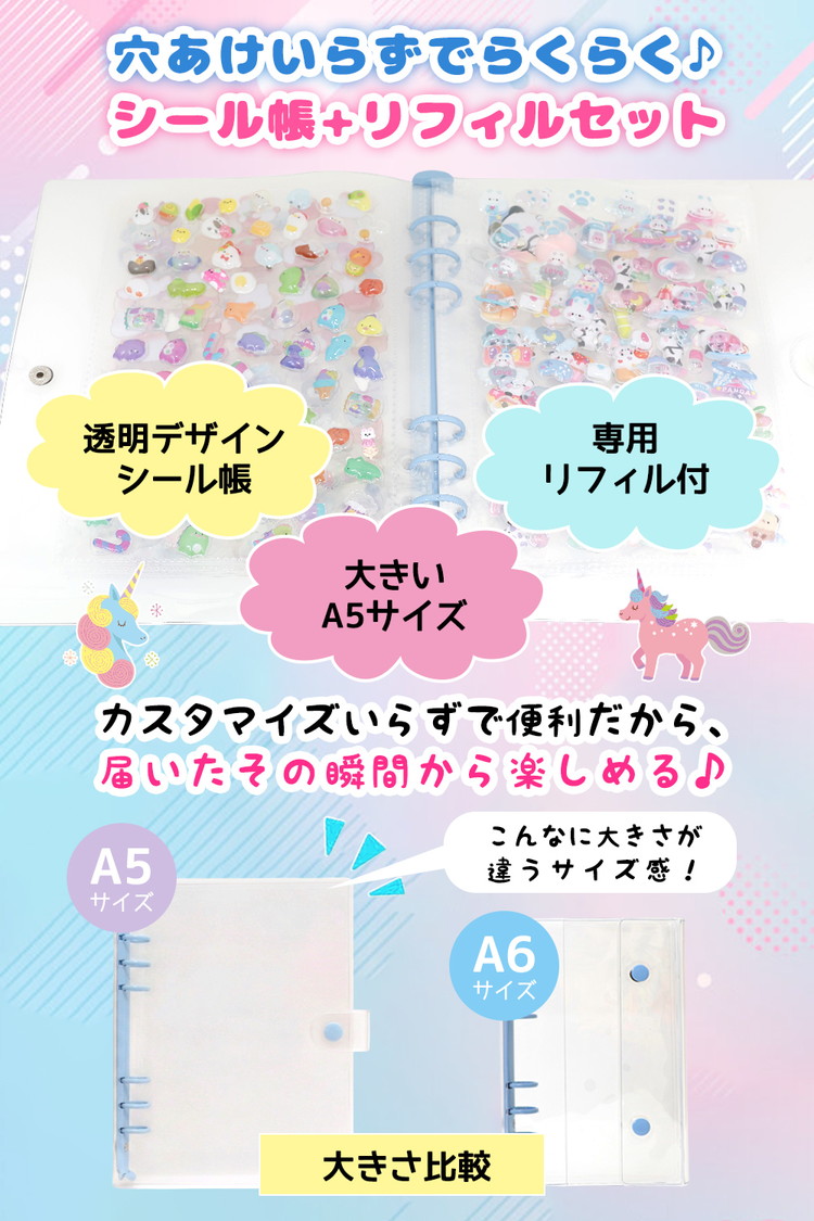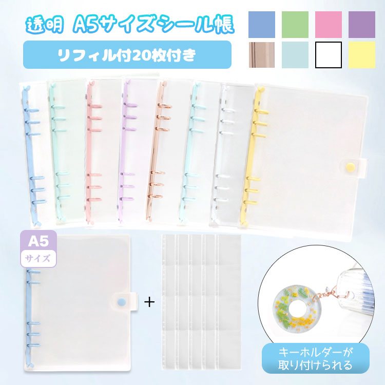 シール帳 A5 大きいサイズ バインダー 【リフィル20枚付】 透明 クリア【5484シリーズ】シールバインダー リフィルのみ有 はがせる レフィル シール手帳 台紙 6穴 女の子 男の子 大人 穴6 クリアバインダー