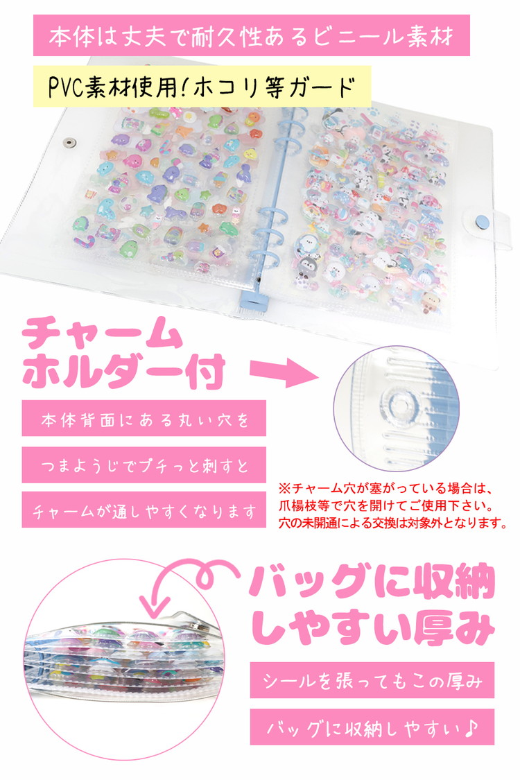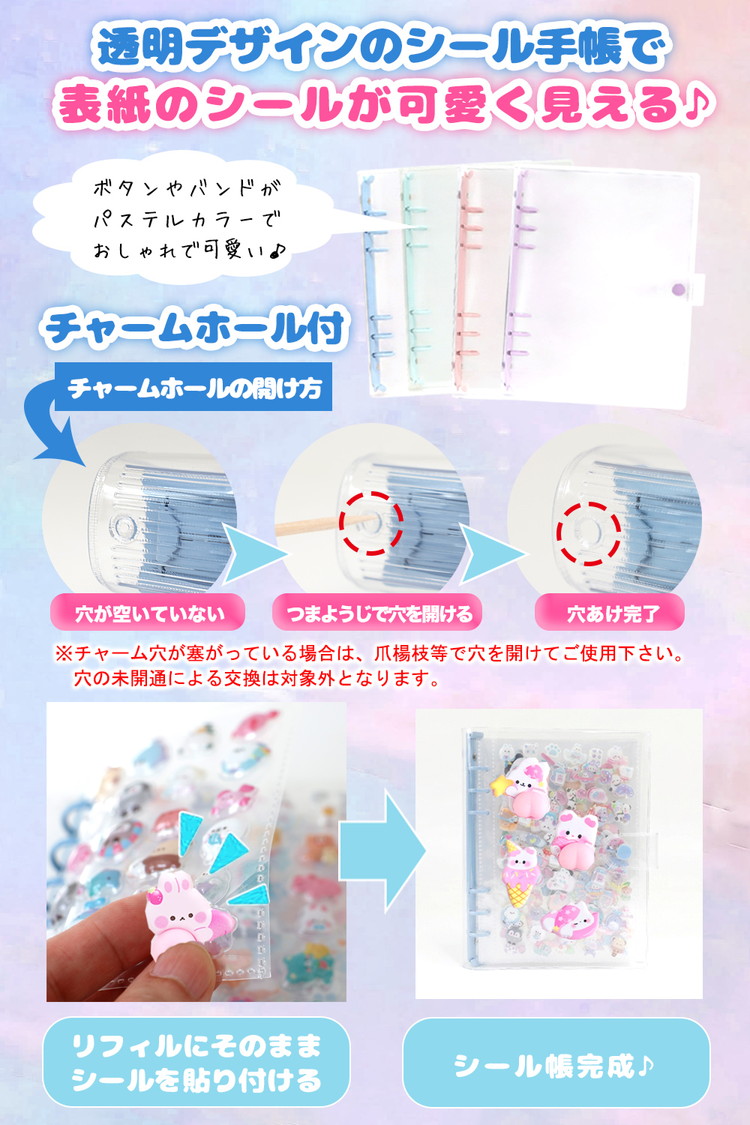 【ポイント3 チャームホール付き】こちらのシール手帳は、どのサイズにもチャームホールが付いています